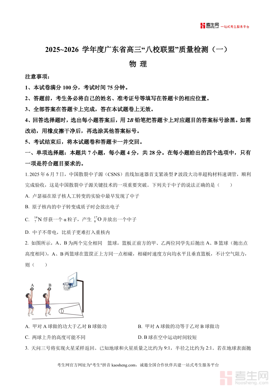 《精品解析:广东省八校联盟2025-2026学年高三上学期质量检测(一)物理试卷(原卷版).docx》是一份针对广东省八校联盟2025-2026学年高三上学期第一次质量检测设计的物理学科原卷资料,对应高三年级上学期初期的阶段性考试需求,符合该联盟学校高三物理学科检测安排,能呈现本次考试的试卷结构、答题规范等核心元信息,为相关使用者提供贴合实际考试场景的数据支持,满足该阶段物理学科检测相关的资料需求。