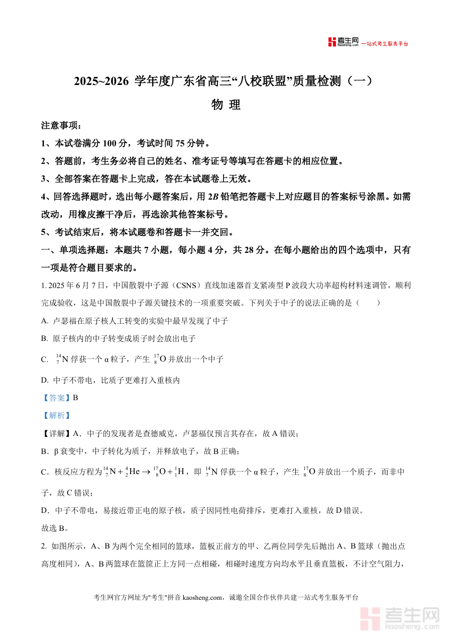 《精品解析:广东省八校联盟2025-2026学年高三上学期质量检测(一)物理试卷(解析版).docx》是一份针对2025-2026学年广东省八校联盟高三上学期第一次质量检测物理科目的专业解析资料,该资料依托本次质量检测物理试卷编制而成,聚焦于本次考试物理科目的试题解析环节,属于高三物理阶段检测配套备考资源范畴,其内容严格对应本次考试试卷要求与考查方向,未涉及无关知识点或拓展内容。