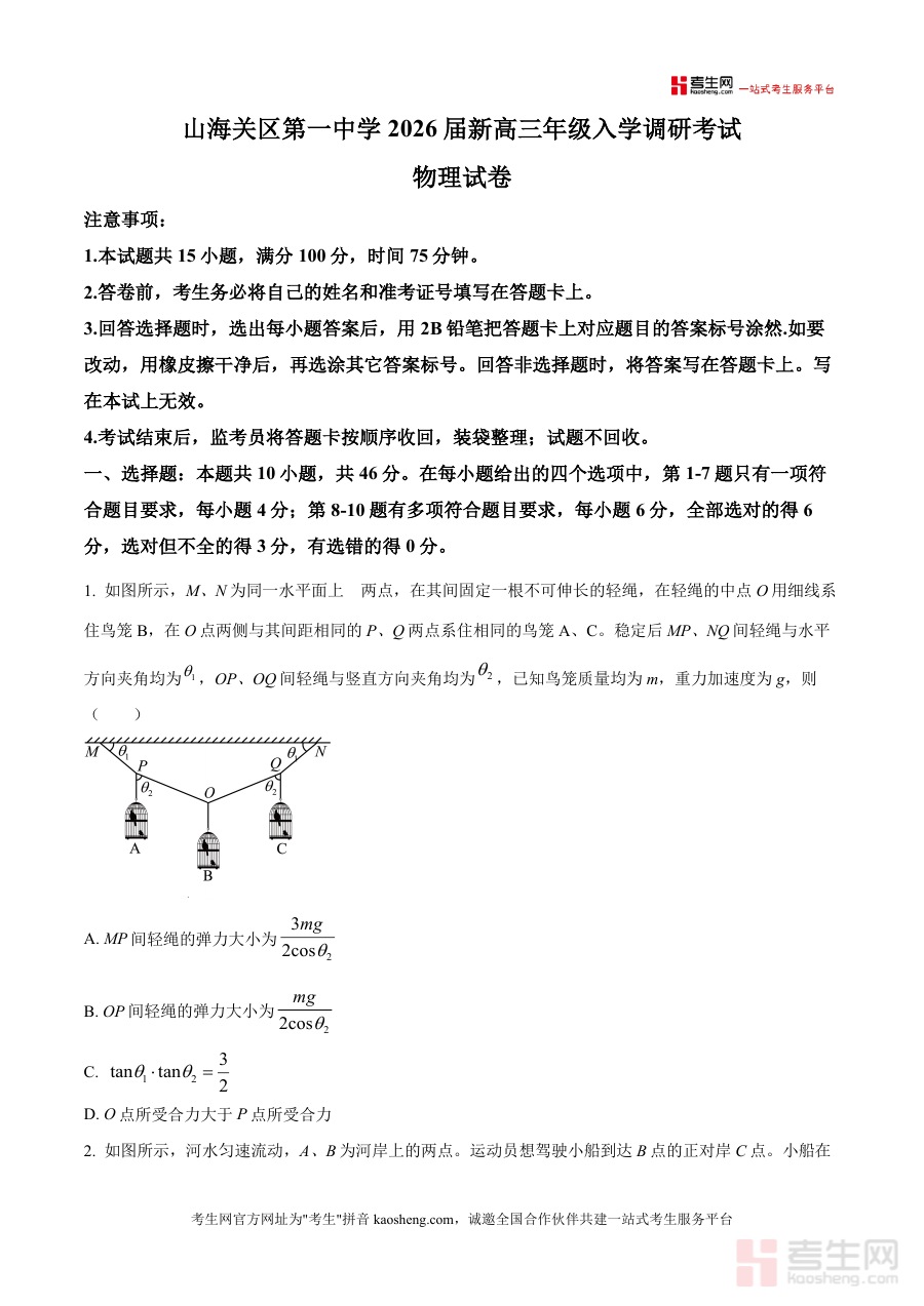 其适用人群包括河北省秦皇岛市山海关区第一中学2026届高三学生群体、承担该年级物理教学任务教师,以及关注该校高三物理入学调研考试形式及结构教育研究者或同类学校备考人员,能够助力相关人员精准把握该次阶段检测物理试题载体特征及使用场景价值,辅助开展针对性教学或备考准备工作。