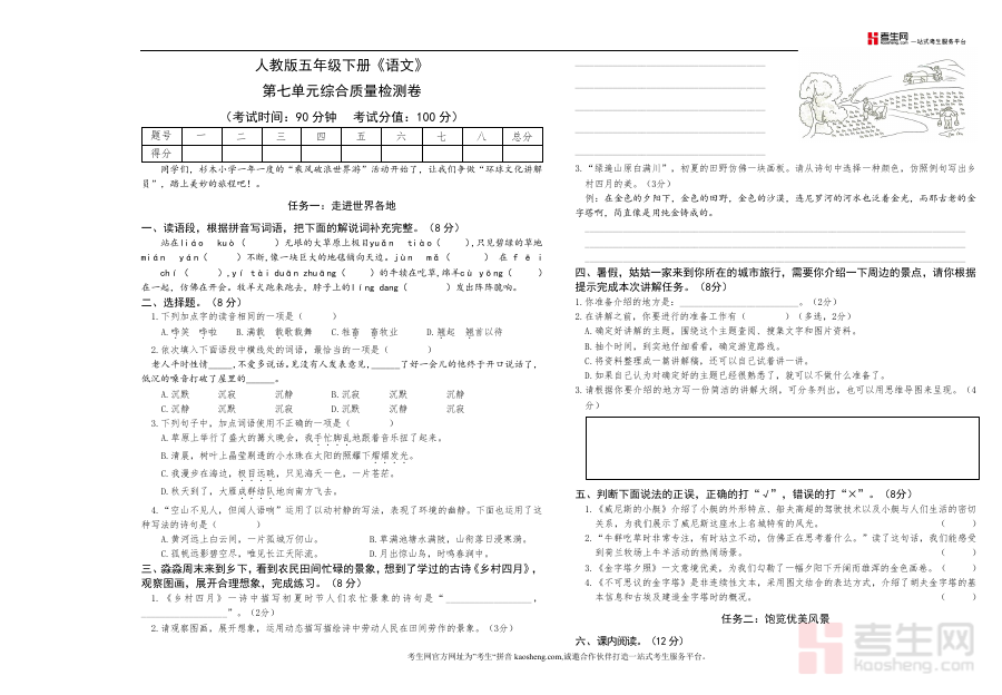 这份资料主要用于五年级下册语文第七单元学习结束后的综合质量评估场景,可作为教师开展学情诊断与教学调整的数据支撑工具,也可帮助学生进行单元学习成果自我检测,其A3排版设计兼顾了内容呈现与使用便捷性,适配常规教学检测流程需求.