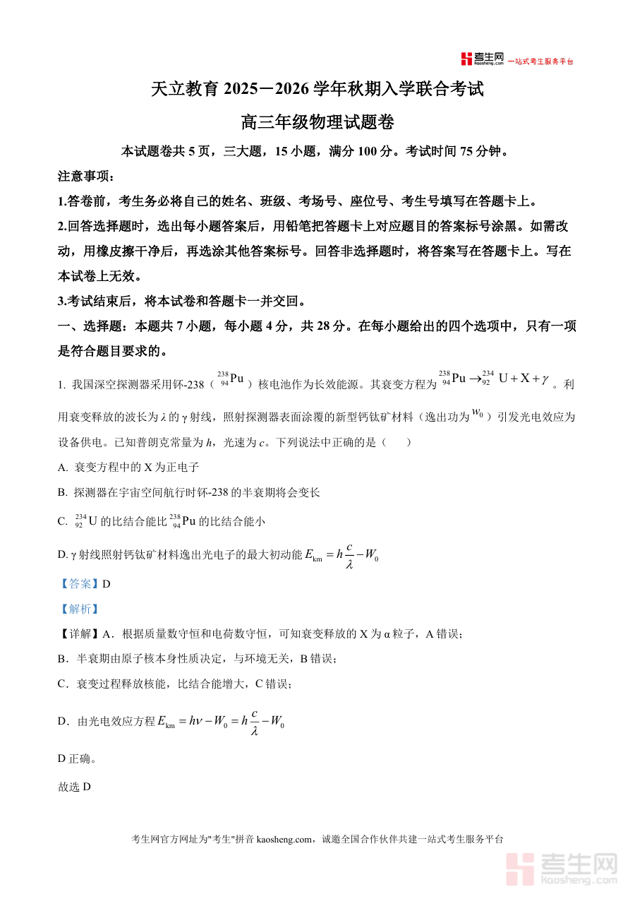 《精品解析:河南省天立教育2025-2026学年高三上学期开学考试物理试题(解析版)》是一份对应河南省天立教育2025-2026学年高三上学期开学联合考试物理学科 的专业解析资料该考试面向天立教育体系内高三学生属于秋季入学阶段重要检测环节旨在通过标准化试题考查学生物理学科基础掌握情况资料以试题解析为核心提供规范准确的答案与思路指引严格基于考试本身元信息呈现不涉及编造具体知识点内容。