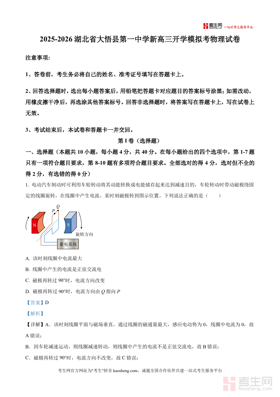 《精品解析:湖北省大悟县第一中学2025-2026学年高三上学期开学模拟考物理试卷(解析版).docx》是一份针对湖北省大悟县第一中学2025-2026学年高三年级上学期开学初期物理模拟考试编写的专业解析类备考资料,精准对应该校新高三学生开学阶段物理学科模拟测试场景,完整呈现该次考试相关规范及解析内容,为使用者提供与考试直接相关的数据参考,满足开学初期物理学科检测及备考规划基础需求.