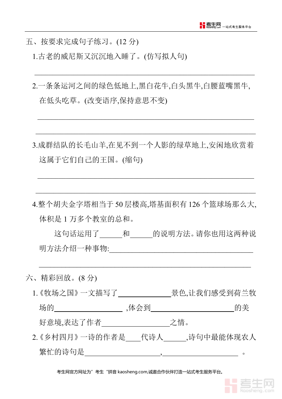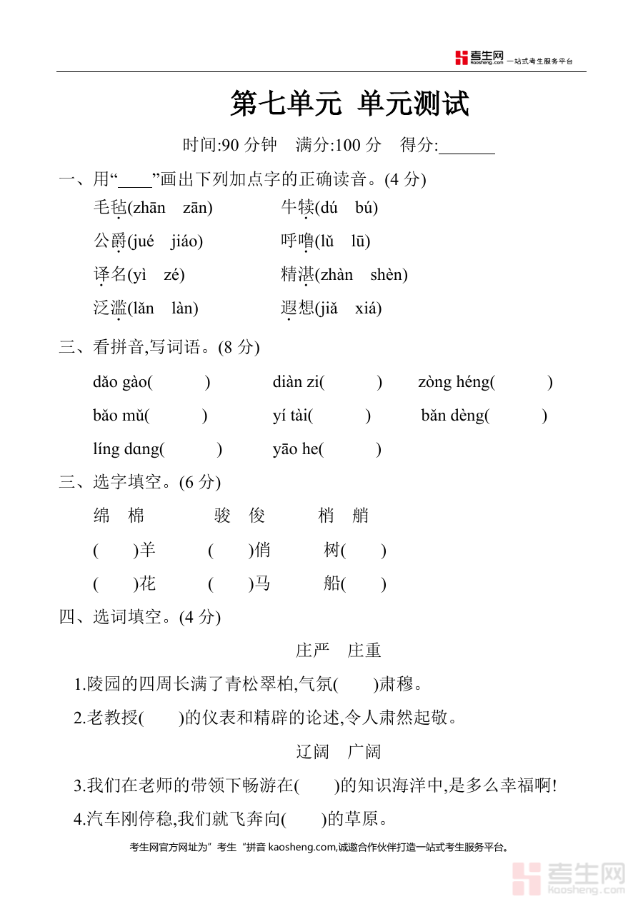 这份资料可用于五年级学生完成第七单元学习后的自我检测,帮助其了解自身知识掌握情况;同时也可作为教师开展单元教学效果评估与学情分析的工具,通过标准化测试内容及答案,为教学调整提供参考方向,辅助提升教学与学习效率。