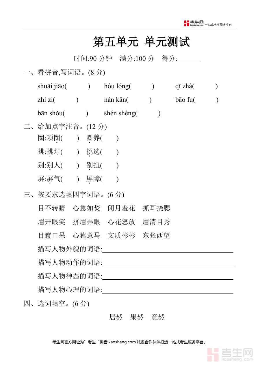 其适用人群为部编版五年级下册学生及相关学科教师,作为单元学习效果的评估载体,它具备清晰的测试结构和明确的评价标准,能有效辅助教学诊断与学习规划,是单元学习阶段不可或缺的参考资料之一。