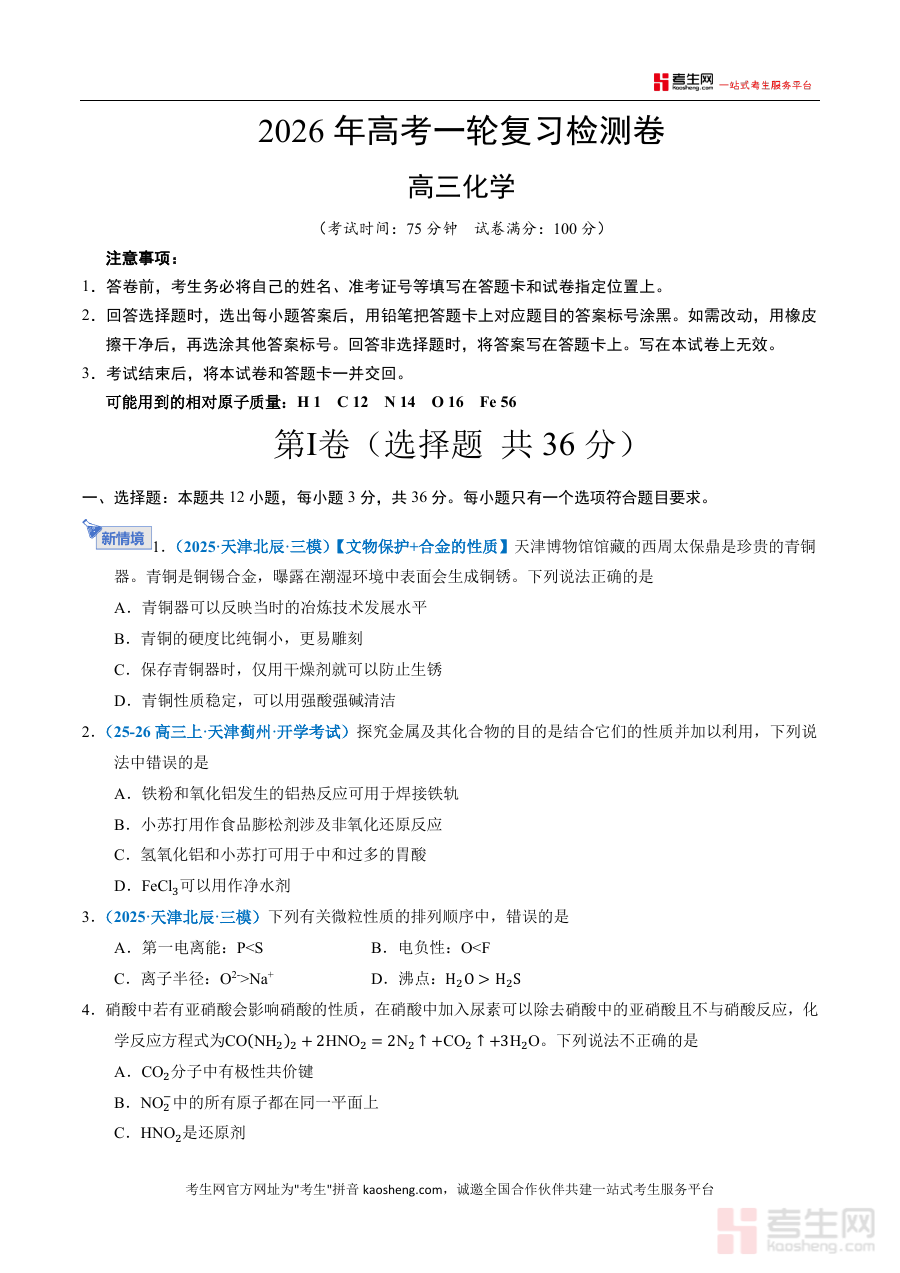 《2026年高考化学一轮复习检测卷(天津卷)(考试版).docx》是一份针对2026年天津地区高考化学一轮复习阶段设计开发的标准化检测类备考资料。该资料严格遵循天津地区高考化学的命题导向与一轮复习阶段性目标,采用考试版形式编排,符合正式考试场景下对试卷格式、时间设置及作答规范等方面的要求,为使用者提供贴近真实考试环境的检测体验。