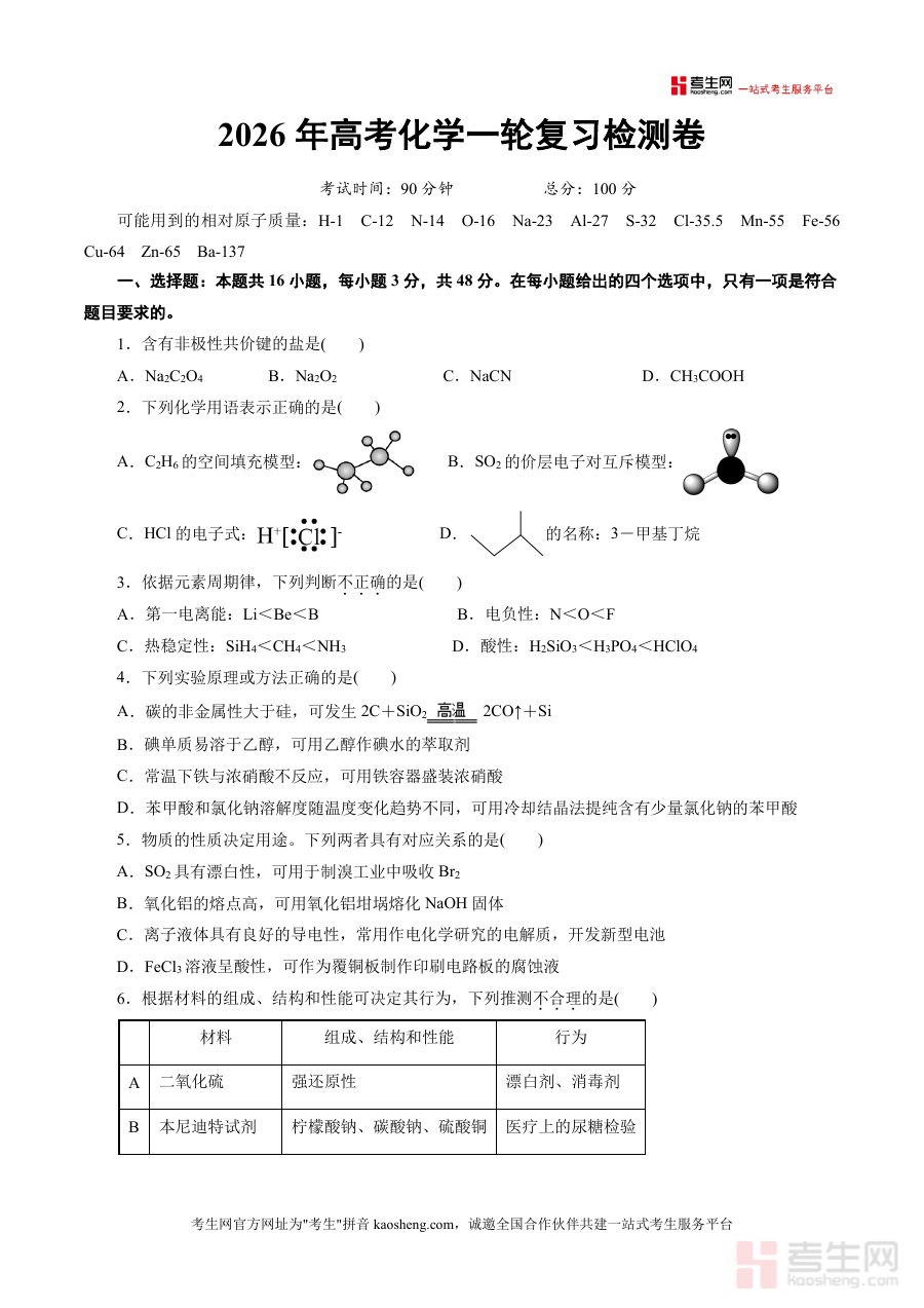 《2026年高考化学一轮复习检测卷(浙江专用)(原卷版).docx》是一份针对2026年高考化学一轮复习阶段设计且专门适用于浙江地区高三学生的检测资料。它严格贴合浙江高考化学考情特点及一轮复习进度安排,能够为使用者提供与当地备考需求高度匹配的参考支持,助力使用者及时把握一轮复习过程中的知识掌握状态,为后续复习方向调整提供基础依据,确保复习内容与浙江高考化学考查方向紧密衔接,帮助使用者高效推进一轮复习进程呢~