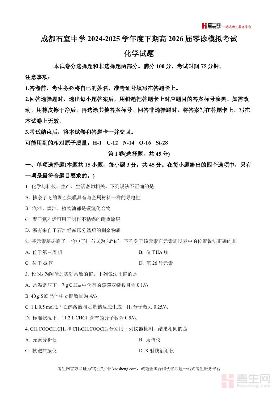 《精品解析:2026届四川省成都石室中学高三零诊模拟考试化学试题(原卷版)》是一份针对四川省成都石室中学高2026届学生在2024-2025学年度下期开展高三零诊模拟考试所设计制作化学学科原卷版备考资料该资料严格遵循零诊模拟考试相关要求完整呈现试卷结构与规范格式为使用者提供贴合实际考试场景参考文本助力其熟悉考试形式与流程基础