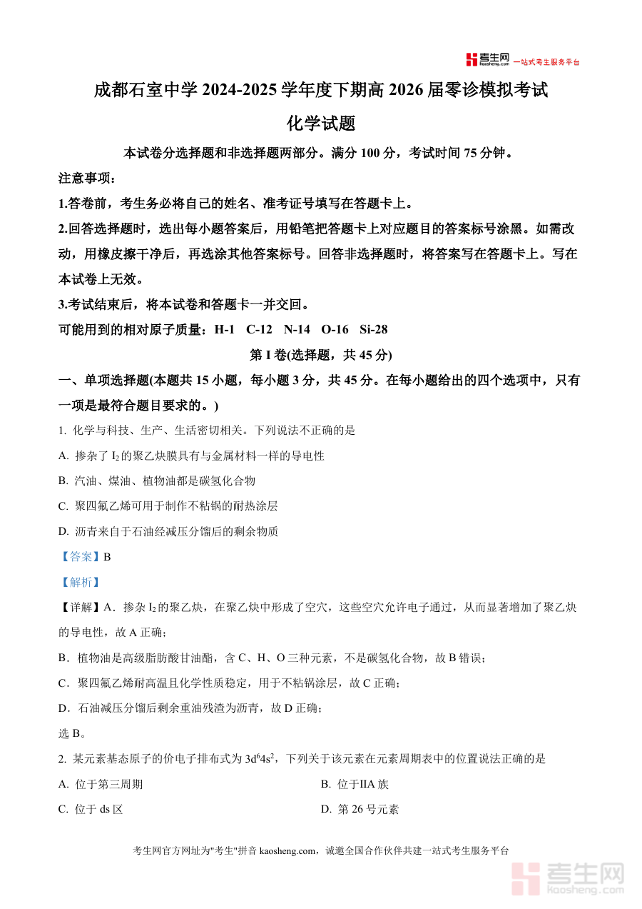 《精品解析:2026届四川省成都石室中学高三零诊模拟考试化学试题(解析版).docx》是一份针对四川省成都石室中学高2026届学生的高三零诊模拟考试化学科目的备考资料,包含该次模拟考试的完整试题及对应解析内容。该资料对应学校在教学进程中安排的零诊模拟考试环节,旨在提供与正式零诊考试形式一致且带有详细解析支持的训练材料,帮助学生提前熟悉考试框架及基本要求。
