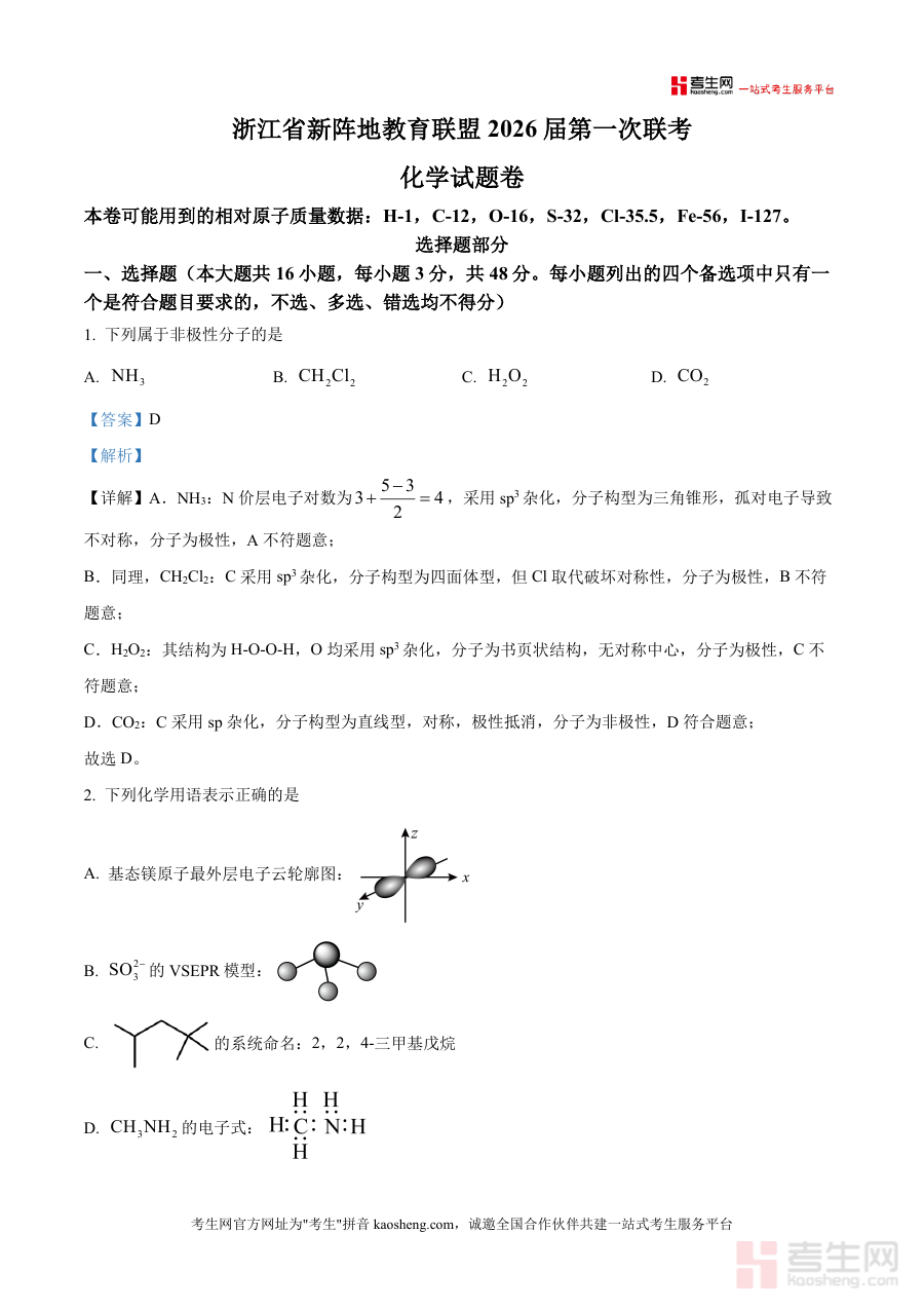 精品解析2026届浙江省新阵地教育联盟高三上学期第。一次模拟预测化学试题解析版docx是一份针对特定阶。段考试的备考资料核心围绕考试的时间地区与用途展开为。考生提供阶段检测与备考参考这份资料的核心用途在于帮。助对应年级的学生明确学习重点通过阶段考试诊断学情为。后续复习规划提供依据无论是开学摸底阶段检。