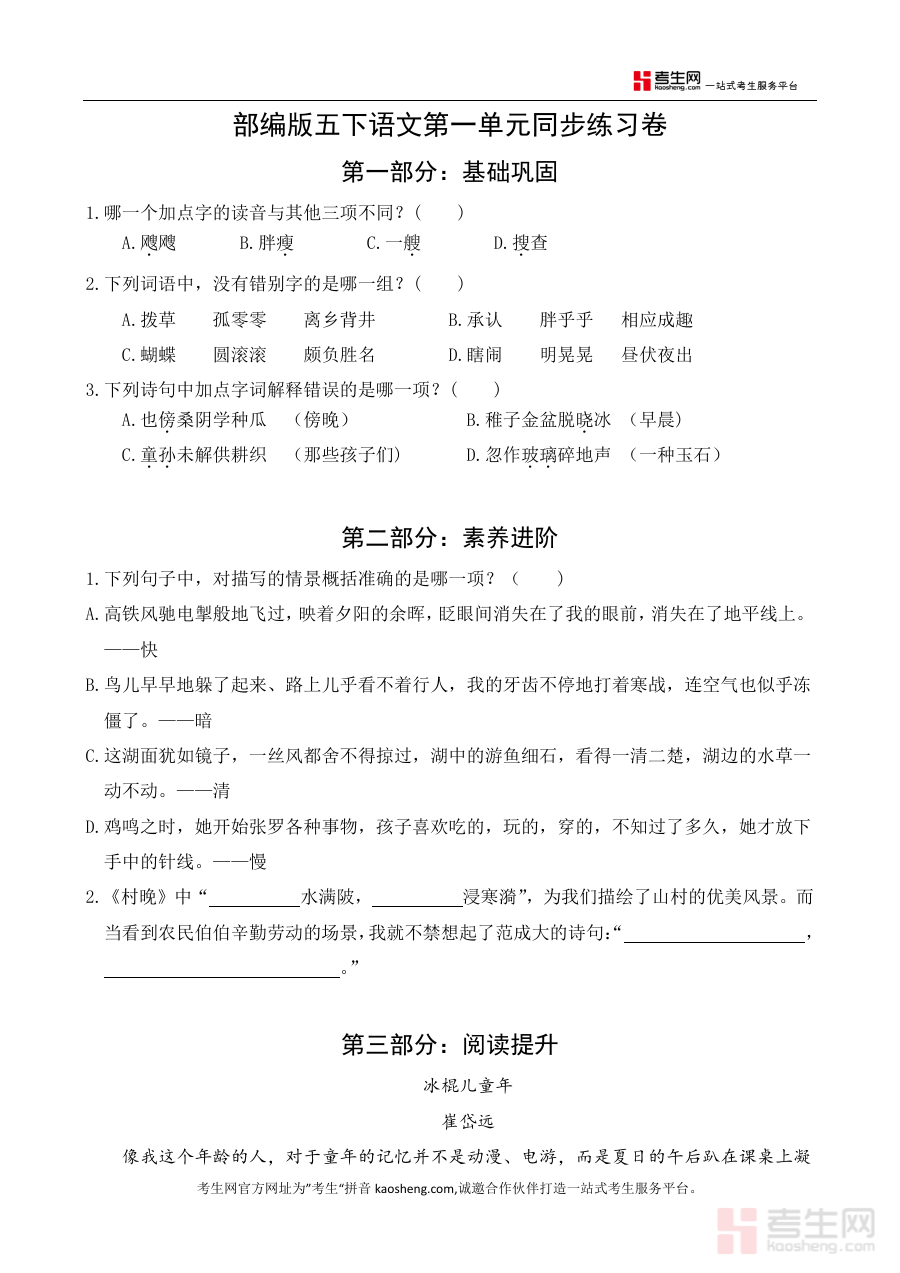 该资料适用于使用部编版教材五年级下册语文第一单元内容进行学习的学生群体,同时可作为教师教学辅助材料或家长辅导孩子时参考使用,其作为同步练习资料,能为使用者提供单元学习情况的阶段性反馈,助力掌握单元学习进度.