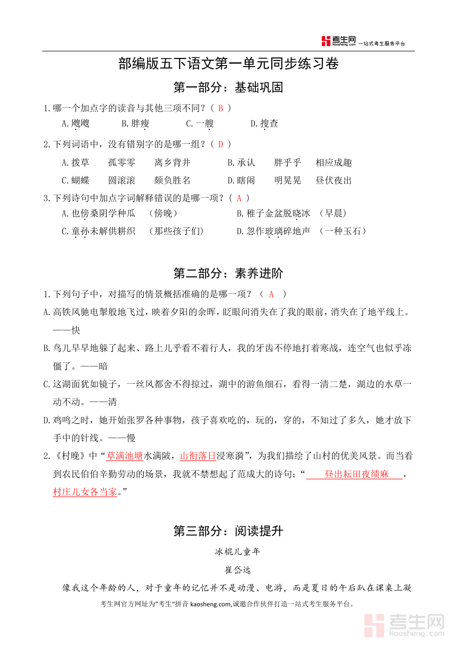 《部编版五下语文第一单元同步练习卷答案.docx》是一份适配2026年部编版五年级下册语文第一单元同步练习卷使用的参考答案资料,针对该单元同步练习卷的题目提供对应解答支持,为使用者提供准确规范的答案参考依据,助力完成练习后的核对环节。