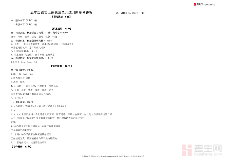 这份资料可用于五年级学生在完成语文上册第三单元学习后的自我检测,也可作为教师或家长对学生单元学习效果的评估材料,通过练习及答案对照,了解单元学习的掌握程度,辅助后续学习规划与调整,不涉及具体题型或内容细节描述.