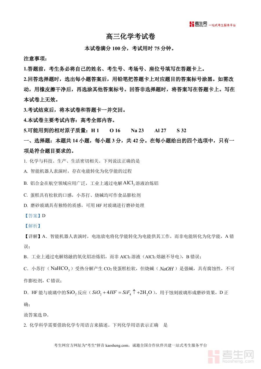 《精品解析:云南省多校联考2025-2026学年高三上学期9月月考化学试题(解析版)》是一份针对云南省多校联合举办、面向高三学生在新学期初期开展阶段性检测而编制化学试题解析资料。本次考试作为2025-2026学年高三上学期首场大型联考,旨在考察学生对高中化学知识综合掌握情况及暑期复习成效,该资料基于此次联考化学考试实际命题情况进行整理分析,旨在向考生提供考试内容对应解析参考,帮助其清晰了解考试形式与作答要求。