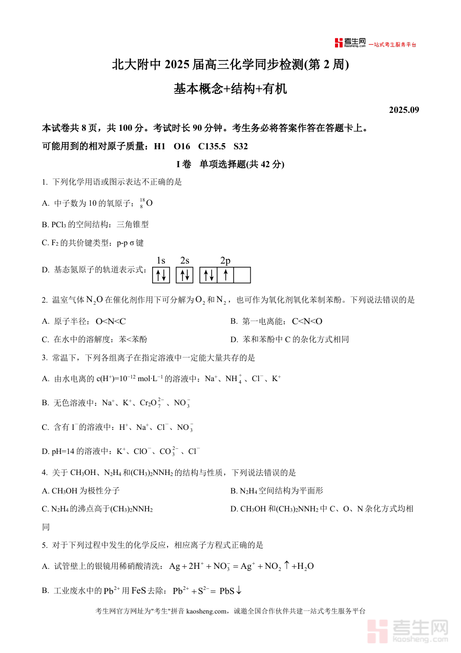 其适用人群为北京大学附属中学2025届高三学生及化学学科教师,也可供关注该校高三化学教学动态或需要同类同步检测资料的教研人员使用。作为阶段性统练原卷资料,它能够为使用者提供贴近实际教学场景的数据参考价值,助力精准定位学习薄弱环节,提升备考与教学工作效率及针对性。