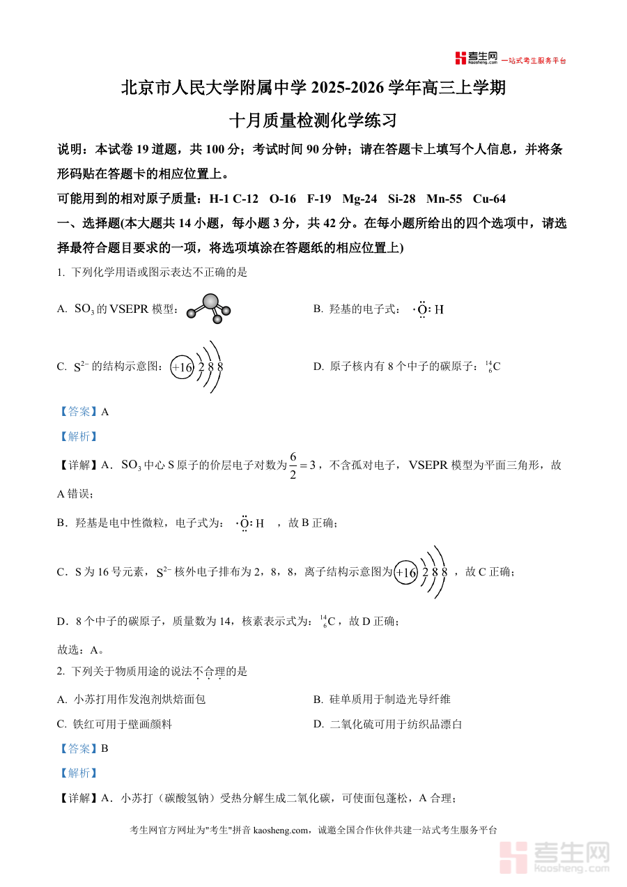 该资料适用于北京市人民大学附属中学及同类学校高三年级学生,以及从事高三化学教学或辅导工作者,作为高三上学期十月质量检测后的配套解析工具,其价值在于帮助使用者准确把握阶段检测考查方向与答题标准,为后续备考规划提供参考依据,不涉及跨阶段或其他学科内容,仅服务于本次化学练习解析的特定需求场景。
