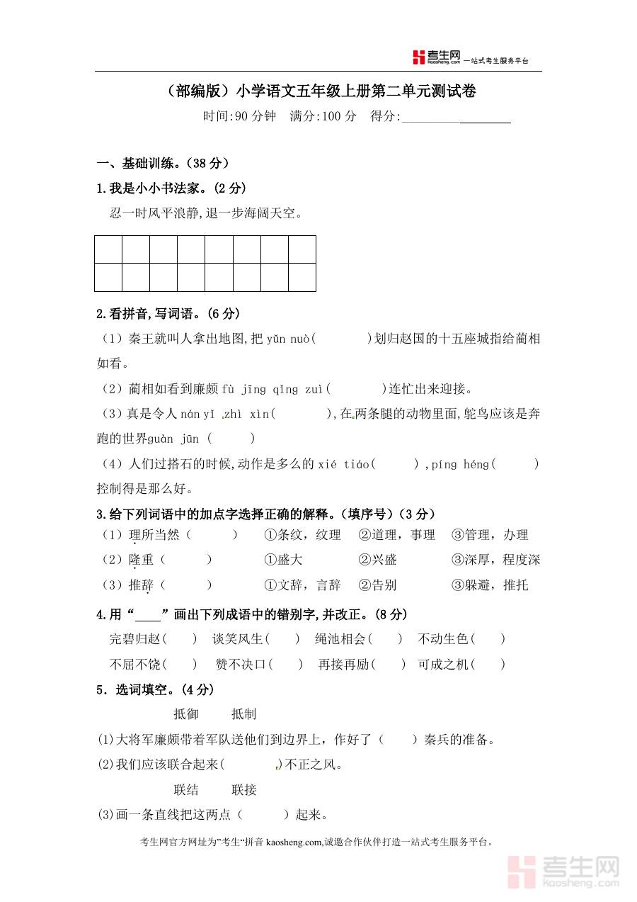 《【精品】人教部编版五年级上册语文第二单元测试卷含答案.docx》是一份适配人教部编版小学语文五年级上册第二单元学习内容的阶段性检测资料,包含完整试卷及对应参考答案,符合该年级该单元教学进度与检测需求,可用于评估学生对第二单元知识的掌握情况。