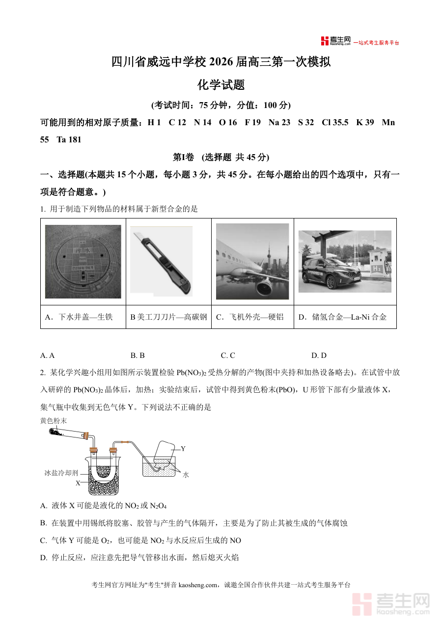 《精品解析:四川省内江市威远中学校2026届高三上学期第一次模拟化学试题(原卷版).docx》是一份针对四川省内江市威远中学校2026届高三学生上学期第一次模拟考试设计的化学学科备考资料,该资料严格遵循该校高三第一次模拟考试的命题规范与时间分值设置(考试时间75分钟,分值100分),为学生提供贴近真实考试的练习载体,帮助学生提前熟悉考试形式节奏与本校命题特点,助力学生适应高三阶段化学考试要求。