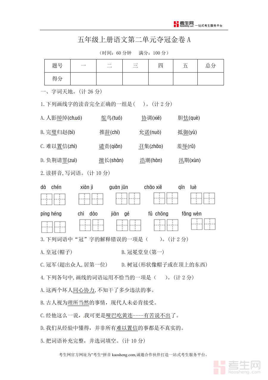 《五年级上册语文第二单元夺冠金卷A(部编版含答案).docx》是一份适用于2026年五年级上册语文第二单元学习阶段使用、依据部编版教材编写的单元检测资料,属于夺冠金卷系列中的A卷类型包含检测内容及对应参考答案元信息明确符合单元学习后的检测需求。