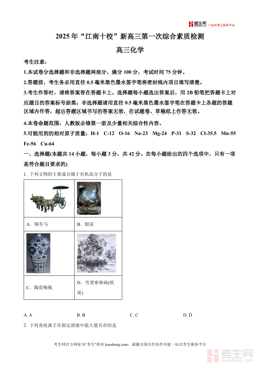 《精品解析:安徽省江南十校2026届高三上学期10月第一次综合素质检测化学试卷(原卷版).docx》是一份对应安徽省江南十校面向2026届高三学生组织实施的上学期第一次综合素质检测化学学科考试要求的原卷版本备考资料;该资料关联江南十校阶段性综合素质评价测试,从元信息可知其命题范围涵盖人教版必修第一册及少量相关综合性内容,但未涉及具体知识点或题型细节描述;作为原卷版资料,它完整保留了此次检测试卷的结构设置与答题规范要求如满分100分、考试时长75分钟等,为备考提供贴合实际场景的载体支撑;它针对特定区域特定阶段检测需求,是专业的备考参考资料形式之一。