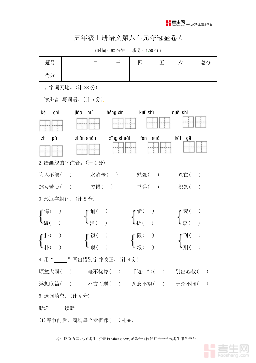 《五年级上册语文第八单元夺冠金卷A(部编版含答案)》是一份针对2026年使用部编版教材体系的五年级学生设计制作完成语文第八单元专项检测资料文件;该资料严格遵循部编版教材五年级上册第八单元相关教学目标与要求进行编制操作执行流程处理,同时包含完整参考答案部分以支持后续学习反馈与结果验证环节有效开展实施操作过程推进工作。