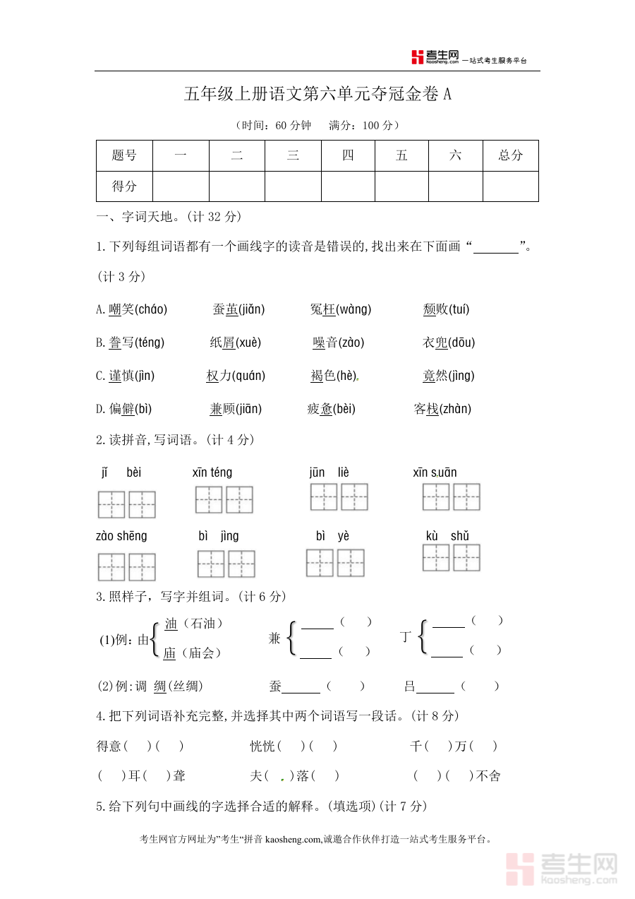《五年级上册语文第六单元夺冠金卷A(部编版含答案)》是一份适配2026年部编版教材体系的五年级上册语文第六单元阶段性检测资料,属于夺冠金卷系列中的A卷类别,且附带完整参考答案及相关答题说明?该资料针对该单元学习内容设计,符合部编版教材教学目标与要求,为使用者提供标准化检测工具及结果参考依据?