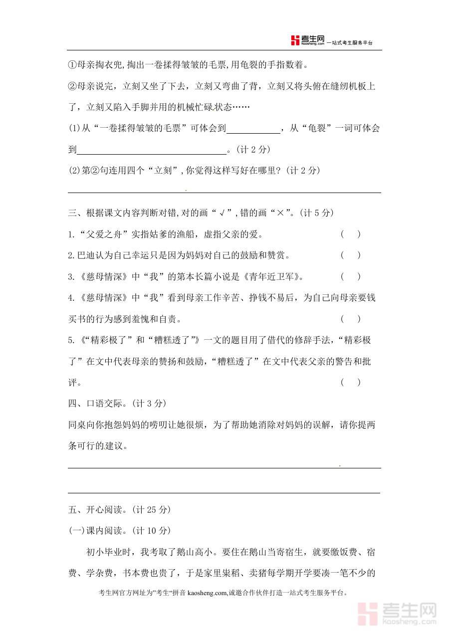 该资料适用于使用部编版教材的五年级学生及相关语文教学人员,作为单元学习后的重要检测工具,具有较强针对性与实用性?能为后续学习规划或教学调整提供可靠参考?辅助提升单元学习质量与教学效率?