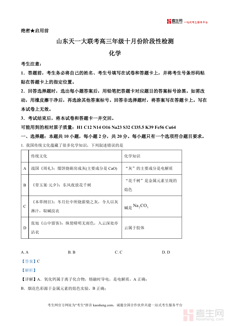 《精品解析:山东天一大联考2026届高三上学期十月份阶段性检测化学试题(解析版)》是一份针对山东天一大联考2026届高三学生上学期十月份阶段性检测设计制作化学科目的备考资料,包含该次考试对应的试题及详细解析内容,基于官方考试元信息整理而成,旨在为相关使用者提供符合考试要求的针对性备考支持,确保资料与考试本身保持高度一致性,不添加任何非官方或编造性内容,仅呈现与该检测直接相关的数据及结构信息,助力使用者获取准确可靠且贴合考试场景的数据支撑。