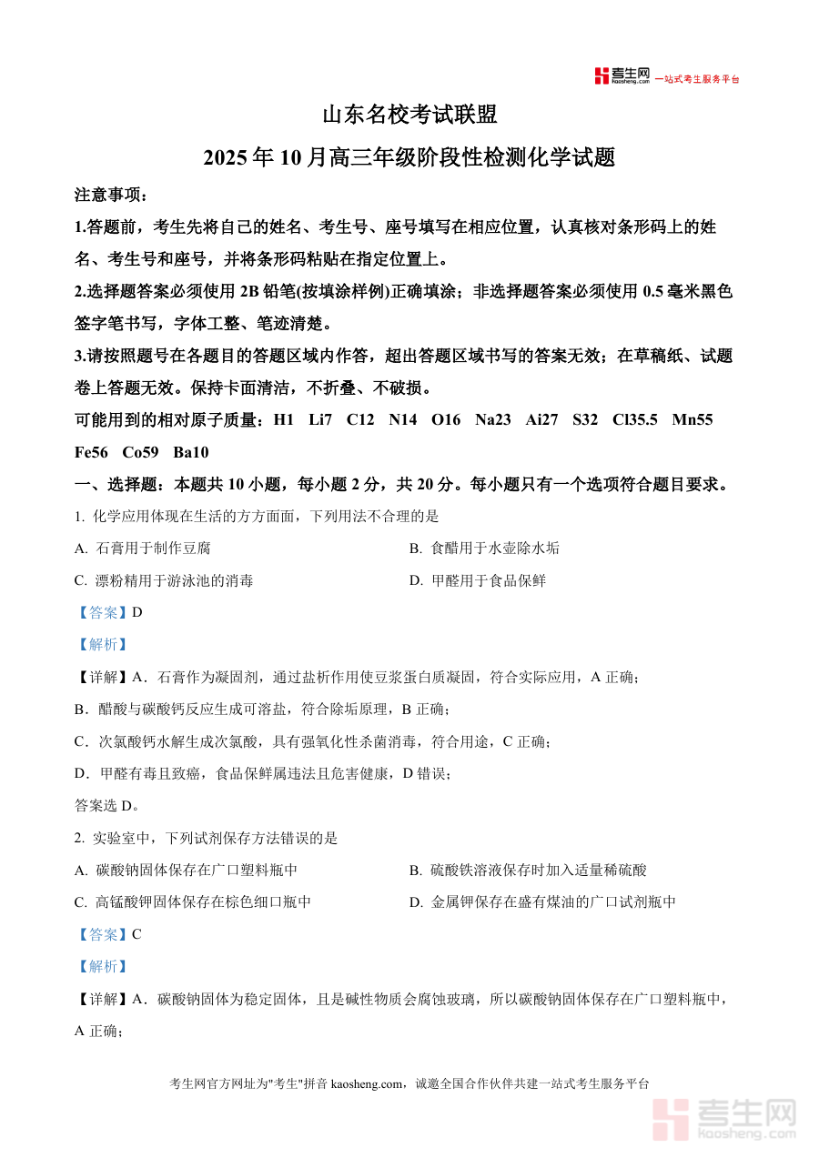 《精品解析:山东省名校考试联盟2025-2026学年高三上学期10月阶段性检测 化学试题(解析版).docx》是一份针对山东省名校考试联盟组织开展的2025-2026学年高三上学期10月阶段性检测化学科目的备考资料,由山东省内多所知名高中组成的考试联盟联合推出,旨在通过阶段性检测帮助高三学生了解自身化学学科学习状况,为后续备考提供参考依据。该资料包含完整试题及详细解析内容,覆盖高三化学阶段学习范畴,体现联盟学校对高三学生化学学习水平的阶段性评估标准,是高三化学阶段学习成果检验的重要参考资料。
