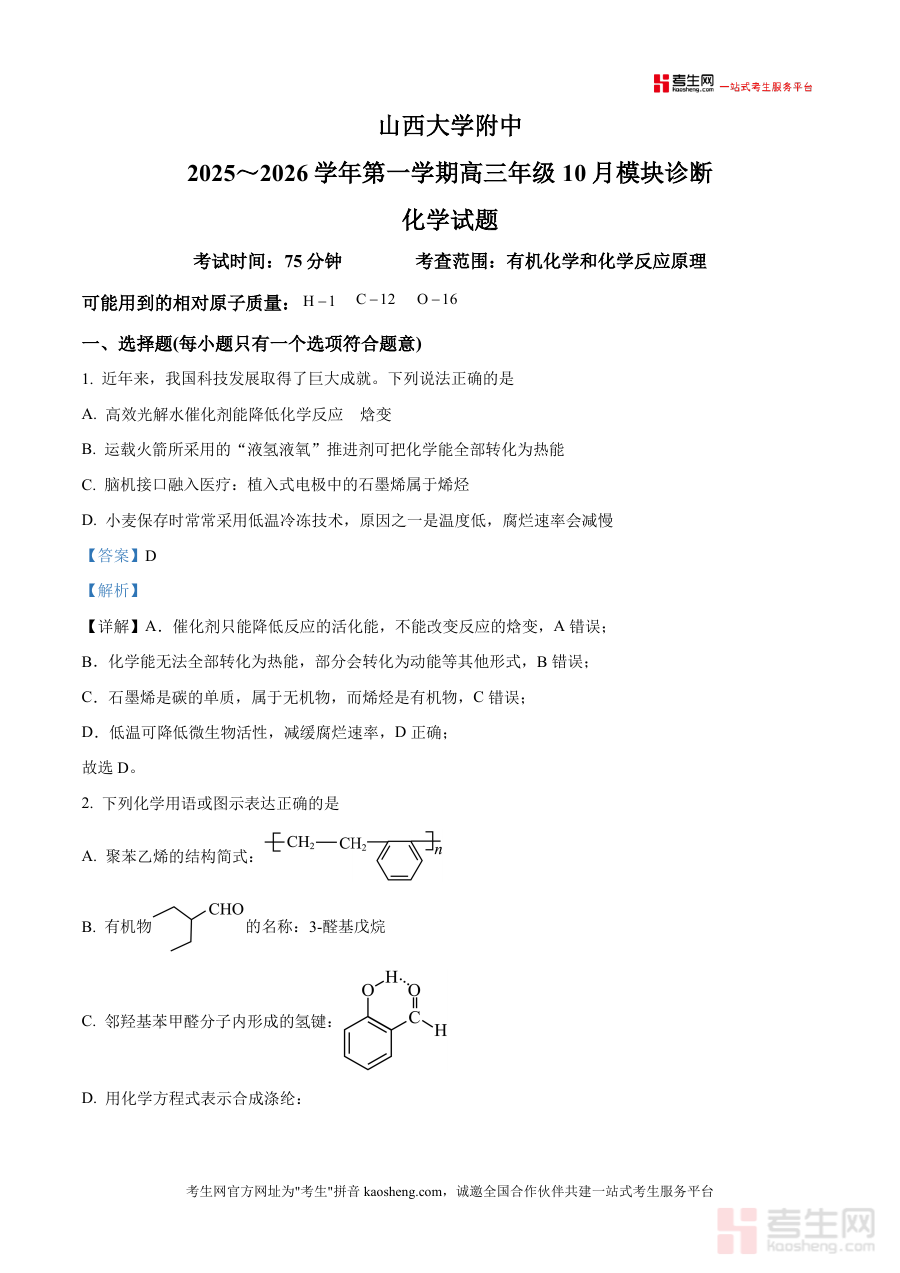 《精品解析:山西大学附属中学校等校2025-2026学年高三上学期10月月考(第四次月考)化学试题(解析版).docx》是一份针对山西大学附属中学校等校在2025-2026学年高三上学期10月组织开展第四次月考所使用化学试题编写而成解析类备考资料。该资料以此次月考化学试题为核心载体,提供全面且详细解题过程及思路说明,旨在帮助使用者深入理解本次考试考查方向及试题设置特点,为后续学习规划及备考安排提供精准参考依据。