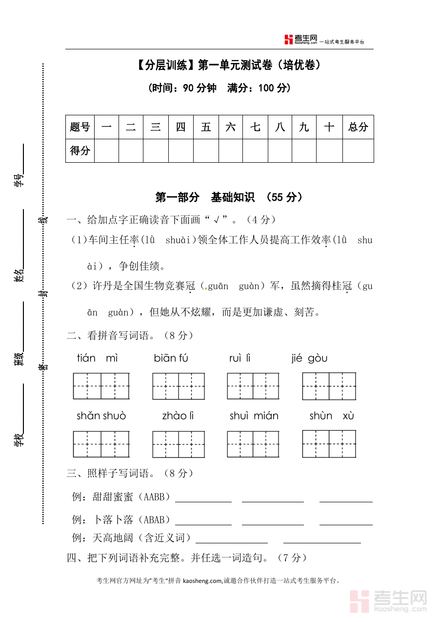 这份资料主要用于四年级语文第一单元学习后的培优巩固与检测场景,使用者可借助它完成单元知识掌握情况的自我评估或教学层面评估,其包含答案的设计为即时核对结果与获取反馈提供了直接条件。