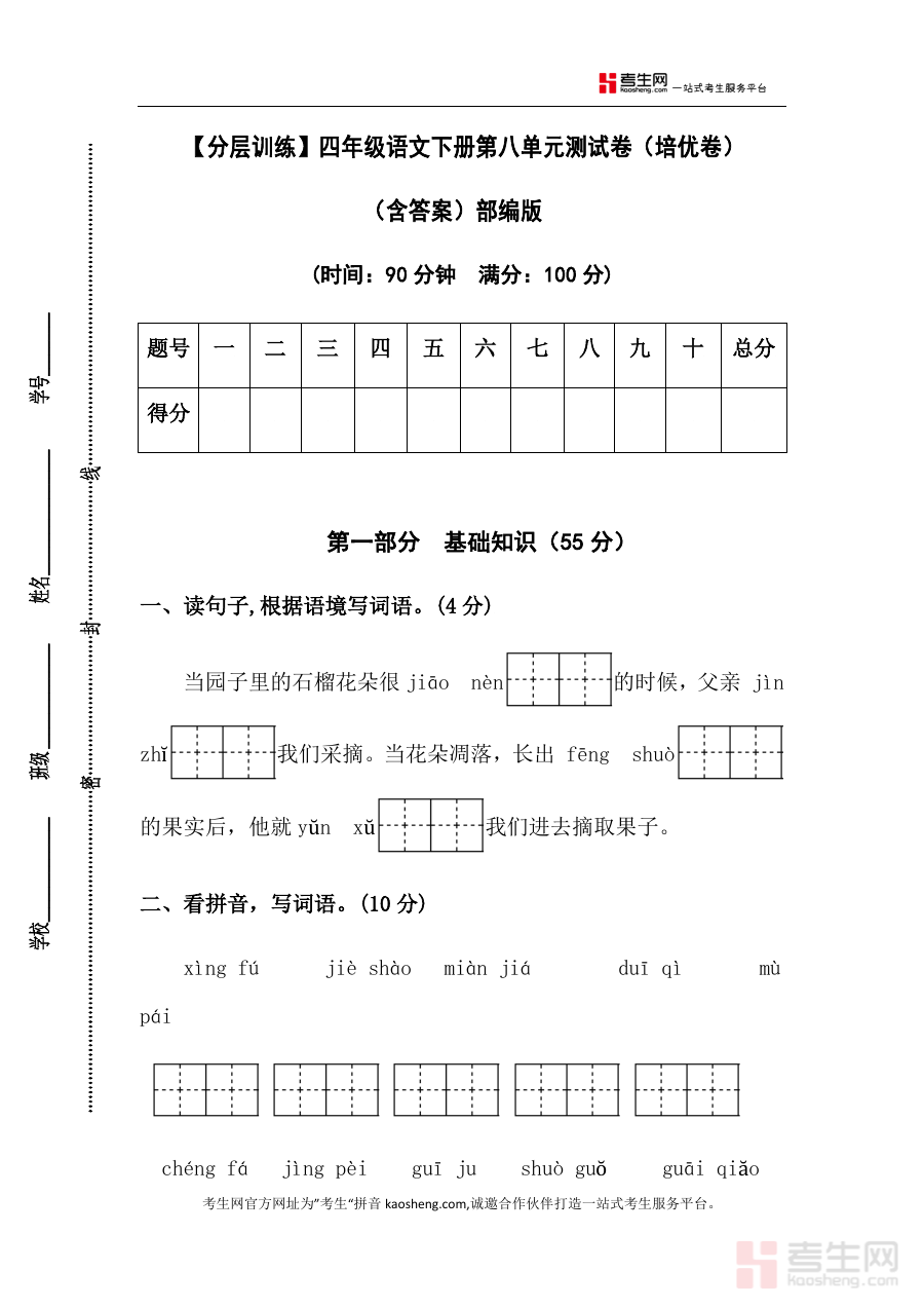 《【分层训练】四年级语文下册第八单元测试卷(培优卷)(含答案)部编版.docx》是一份针对部编版四年级语文下册第八单元内容编制的培优类测试资料,属于分层训练体系中的专项检测资源之一,包含完整测试卷及配套参考答案,为使用者提供单元知识培优检测的工具支持,符合四年级语文下册第八单元教学目标与要求,是分层教学背景下的针对性资源.