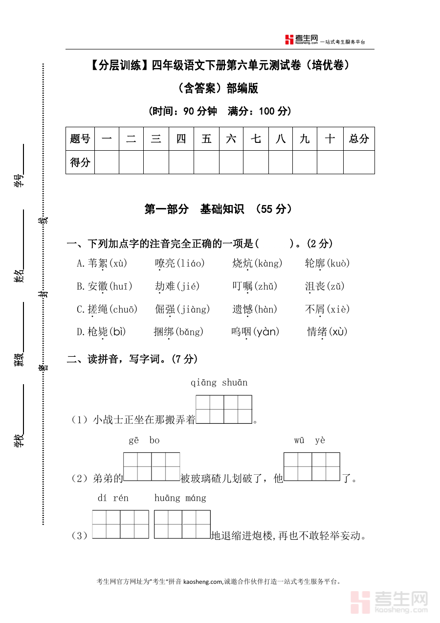 该资料适用于四年级语文下册第六单元学习后的培优巩固与能力验证,含答案设计便于使用者进行自主核对或教学反馈,支持阶段学习效果的评估与调整,其分层训练属性符合培优提升需求定位,不涉及具体使用场景中的操作细节或内容解析。
