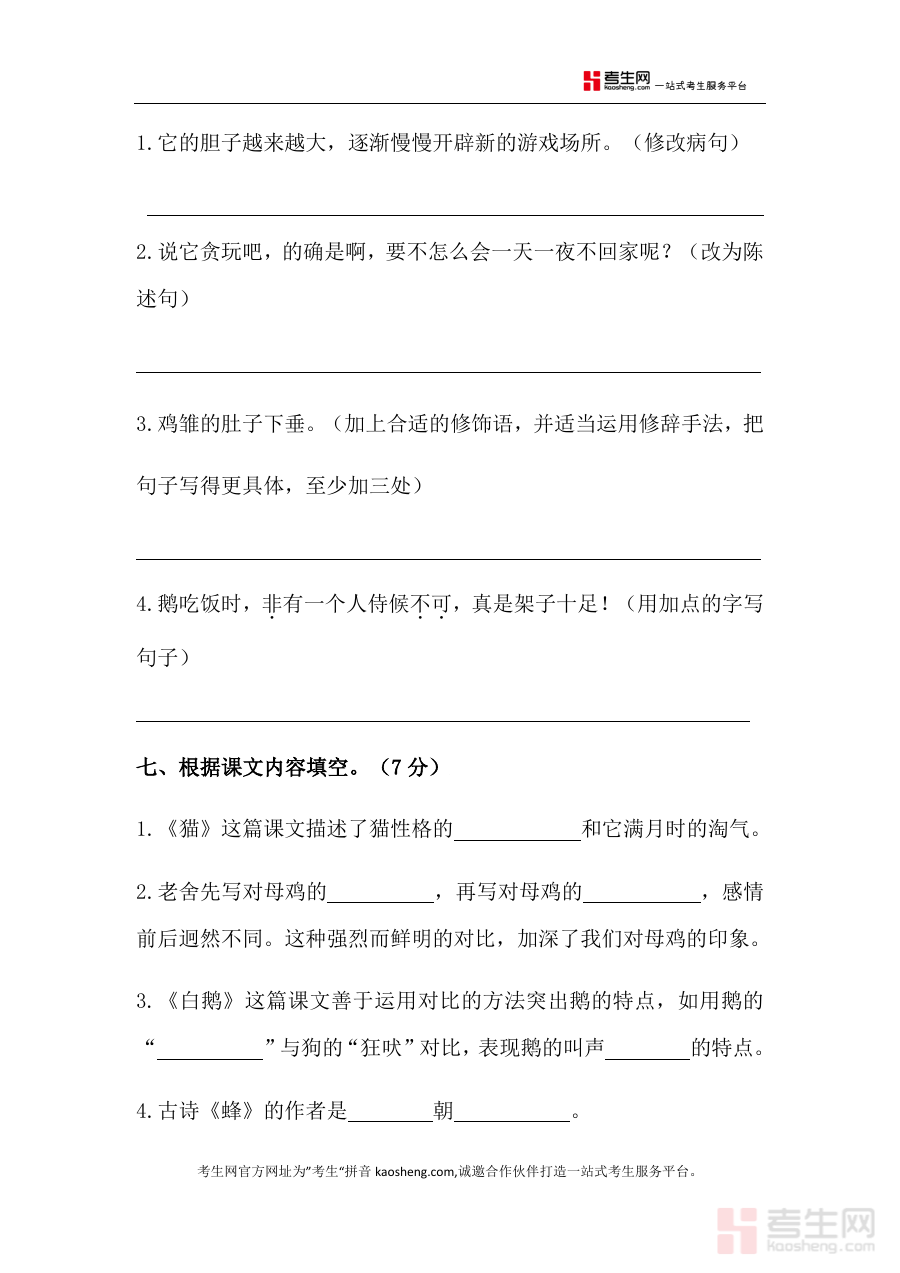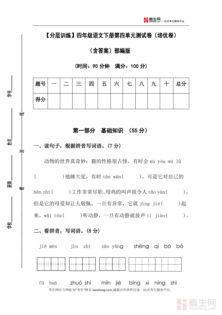 这份资料的用途在于可作为四年级学生在语文下册第四单元学习结束后的巩固与进阶检测工具,帮助使用者通过测试了解自身对本单元知识掌握情况,并借助答案进行自主核对与学习效果评估;同时,它也能为教学者提供关于学生单元学习情况的参考依据,辅助开展教学调整。