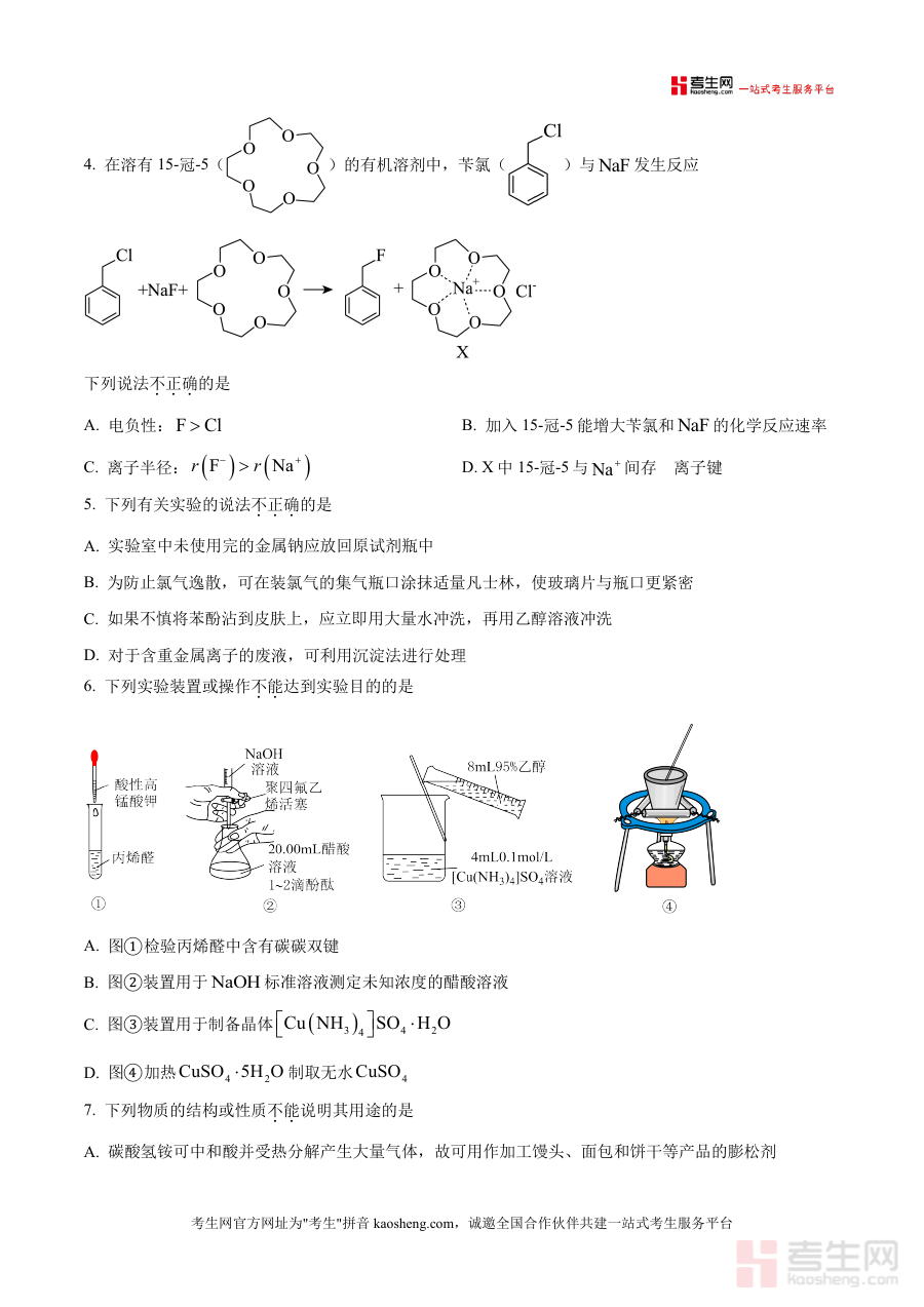 这份资料主要用于高三学生对该阶段联考化学试题进行实际演练,帮助使用者熟悉联考化学试卷结构及答题规范;也可为教学人员提供该次联考化学科目的原始命题载体,用于学情分析或教学参考。它作为该次联考化学科目的原始试卷呈现形式,能够让使用者直观接触到该次考试化学科目的命题形式与试卷规范,但不涉及具体备考策略或内容解读,仅聚焦于原卷资料作为检测工具及参考载体这一核心用途定位。