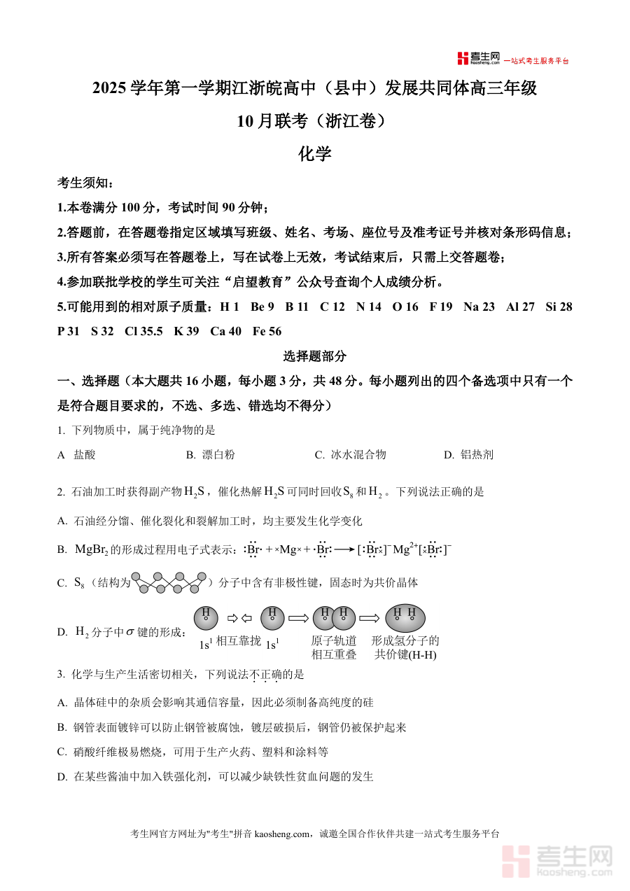 《精品解析:浙江省江浙皖高中(县中)发展共同体2025-2026学年高三上学期10月联考(浙江卷)化学试题(原卷版)》是一份面向2025-2026学年高三上学期10月期间参加江浙皖高中(县中)发展共同体联考的浙江卷化学学科原卷资料。该资料对应高三年级上学期初期阶段检测场景,贴合浙江地区联考命题背景,为相关师生提供了该次联考化学科目的原始试卷呈现形式,助力使用者了解该次联考化学试题的整体框架与规范要求,不涉及具体知识点解析或题型细节内容,仅基于联考场景与原卷属性传递基础元信息。