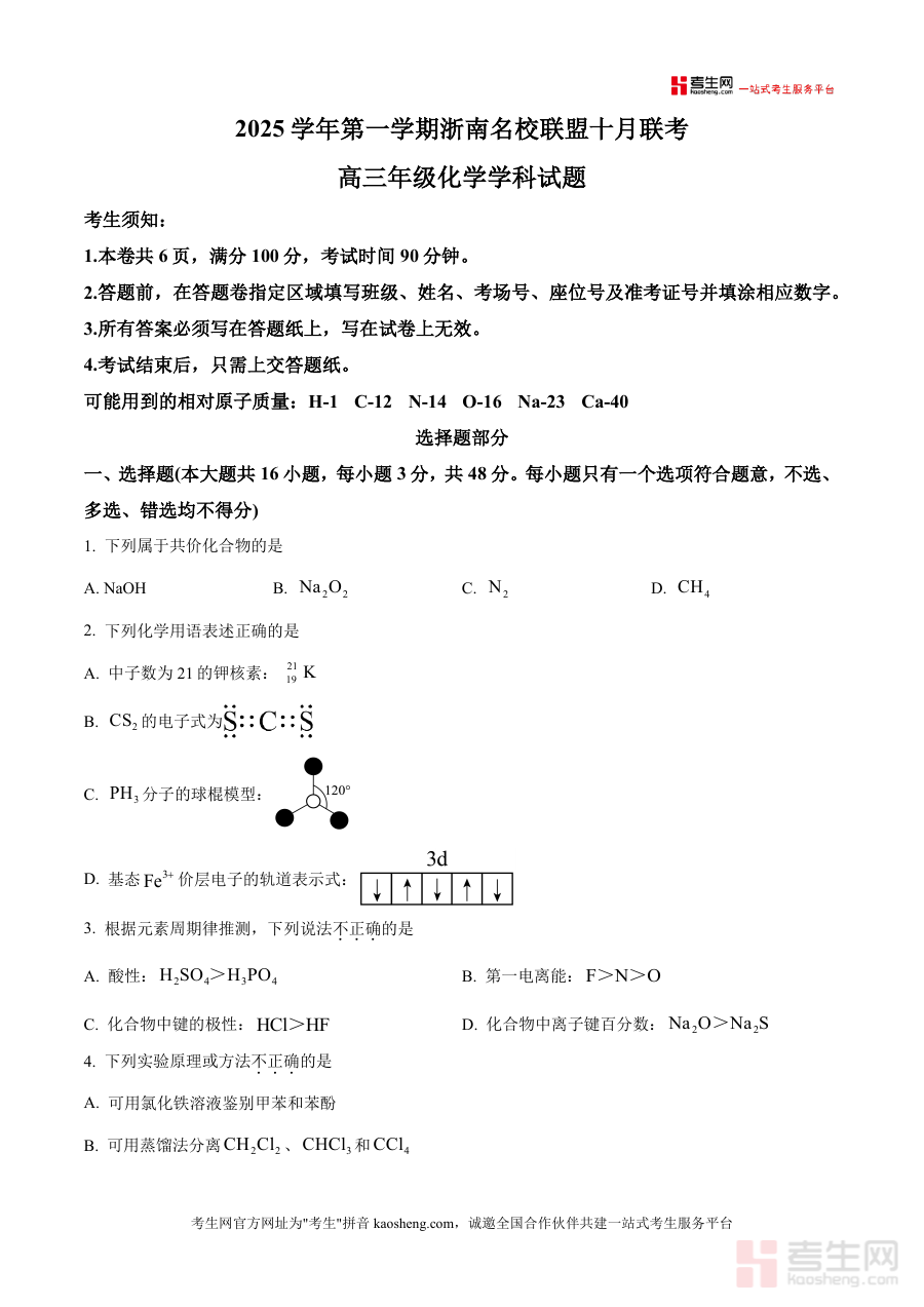 《精品解析:浙江省浙南名校联盟2026届高三上学期十月联考(一模)化学试题(原卷版).docx》是一份面向浙江省浙南名校联盟2026届高三学生,对应2025学年第一学期十月举行的一模联考化学科目的原始试卷资料。该资料呈现了本次联考化学科目的完整试题文本框架,包含考试须知、相对原子质量等基础考试信息,旨在为使用者提供贴合实际联考情境的试题载体,不涉及具体知识点或题型解析,仅还原考试原题的呈现形式与结构逻辑。