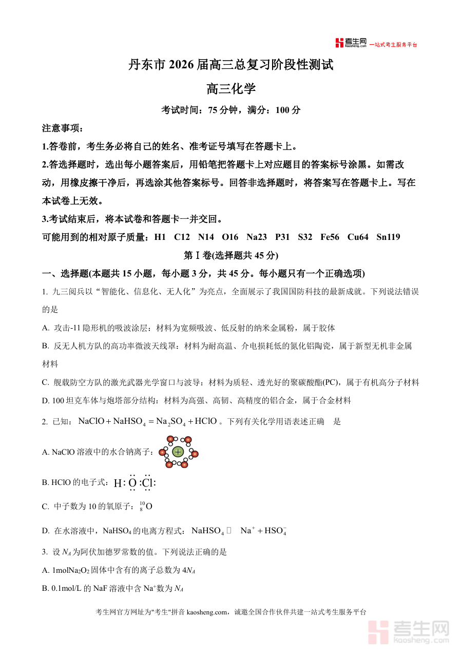 《精品解析:2026届辽宁省丹东市高三上学期总复习阶段测试化学试卷(原卷版)》是一份针对2026届辽宁省丹东市高三学生上学期总复习阶段化学测试设计制作的原卷形式备考资料,其元信息明确对应该地区该届学生的总复习阶段性检测需求,符合高三上学期化学学科阶段性复习成果检验的场景,能够精准匹配本地高三化学总复习阶段测试相关备考需求,为使用者提供贴合本地考试实际情况资源支持.
