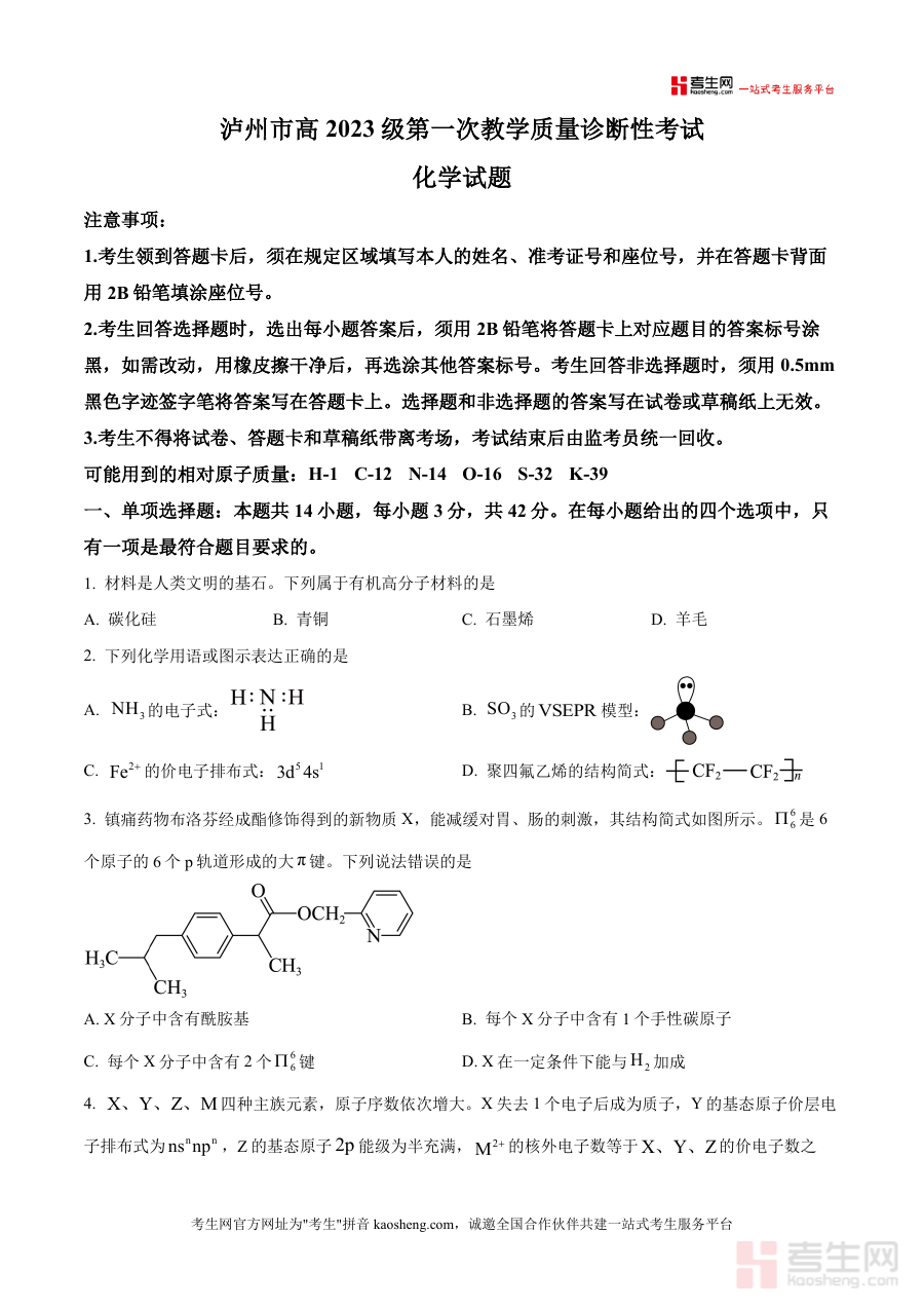 《精品解析:四川省泸州市2026届高三上学期第一次教学质量诊断性考试化学试题(原卷版).docx》是一份针对四川省泸州市教育系统组织开展的2026届高三学生上学期第一次教学质量诊断性考试制作而成的化学学科原卷版资料,它严格遵循此次考试的官方命题格式与呈现规范,完整保留了试题的原始面貌,能够让使用者直接接触到与正式考试一致形态的内容载体,是该次诊断性考试化学学科备考过程中的重要参考素材之一.