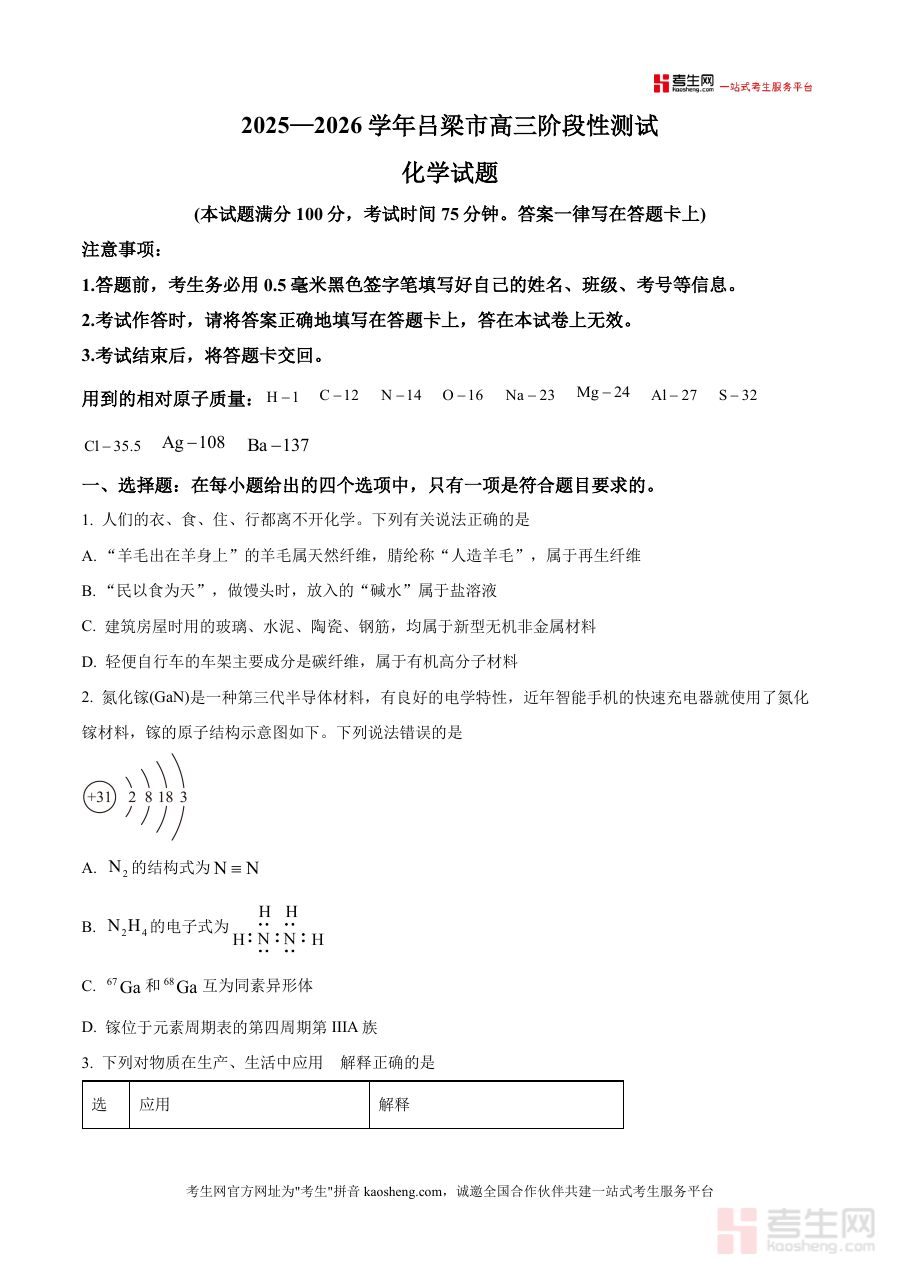 这份资料核心用途在于为山西省吕梁市2025-2026学年高三学生提供上学期化学学科阶段性测试试题原卷内容,帮助学生了解该阶段检测试题呈现形式及考试基本要求框架,为学生开展阶段性自我检测或备考练习提供依据;同时也可为相关学科教师提供该次阶段性测试试题参考,辅助教师进行教学效果评估及后续教学安排调整,其用途聚焦于阶段检测相关备考与教学辅助方向,未涉及具体内容解析或题型分析层面信息。