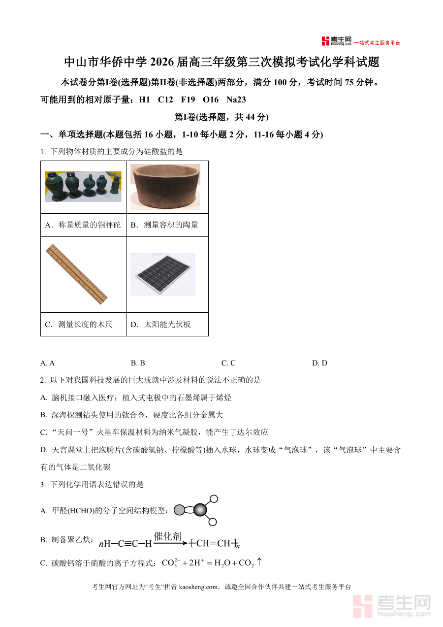 本资料适用人群为广东省中山市华侨中学2026届高三学生及该校化学学科教师,此外也可为其他同类学校高三年级化学备考提供参考依据,作为高三上学期重要阶段模拟考试的原卷资料,其具有反映阶段学习成果检测标准与方向价值,能有效支持师生评估学习状态并优化备考策略。