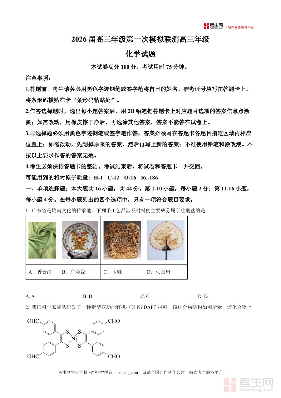 《精品解析:广东省深圳市2026届高三上学期模拟预测化学试题(原卷版).docx》是一份面向广东省深圳市2026届高三学生设计的化学学科模拟预测考试原卷资料。该资料对应高三上学期阶段,贴合当地高三化学备考阶段性特征,呈现了模拟预测考试应有的规范结构与形式要求,为使用者提供符合实际考试情境的练习载体,助力其熟悉该阶段考试基本框架与流程,满足阶段性备考的基础需求。