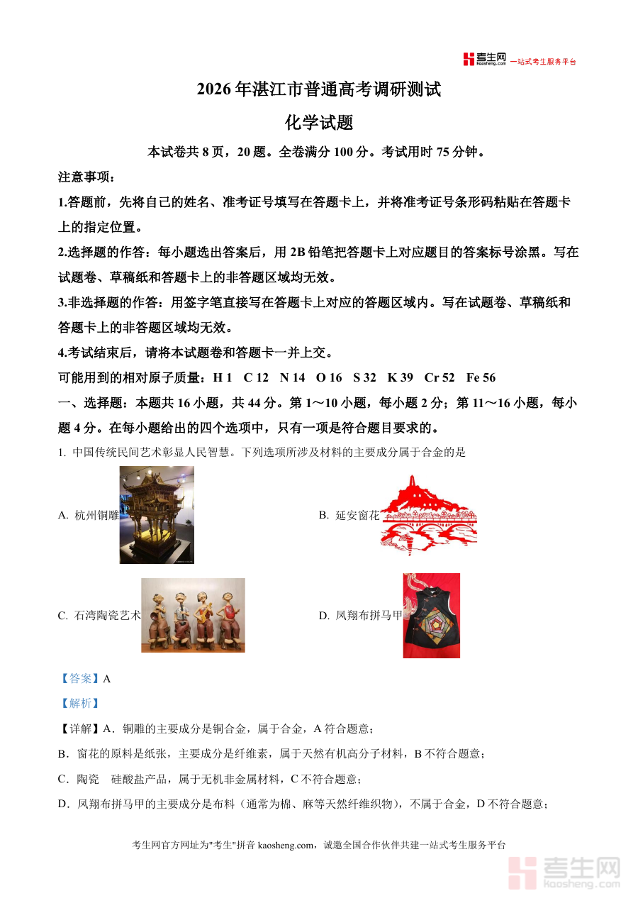 《精品解析:广东省湛江市2026届高三上学期调研考试化学试题(解析版)docx》是一份针对广东省湛江市2026届高三学生上学期调研考试化学科目的备考资料,对应2026年湛江市普通高考调研测试的化学试题。根据文件内容片段可知,该试卷共8页含20题,全卷满分100分,考试用时75分钟,本资料附带详细解析内容,紧密贴合该地区高三学生备考进度,旨在帮助使用者获取对应考试相关参考信息,满足高三化学学科备考过程中的资料需求,所有描述均基于文件提供元信息,无编造知识点或题型细节。