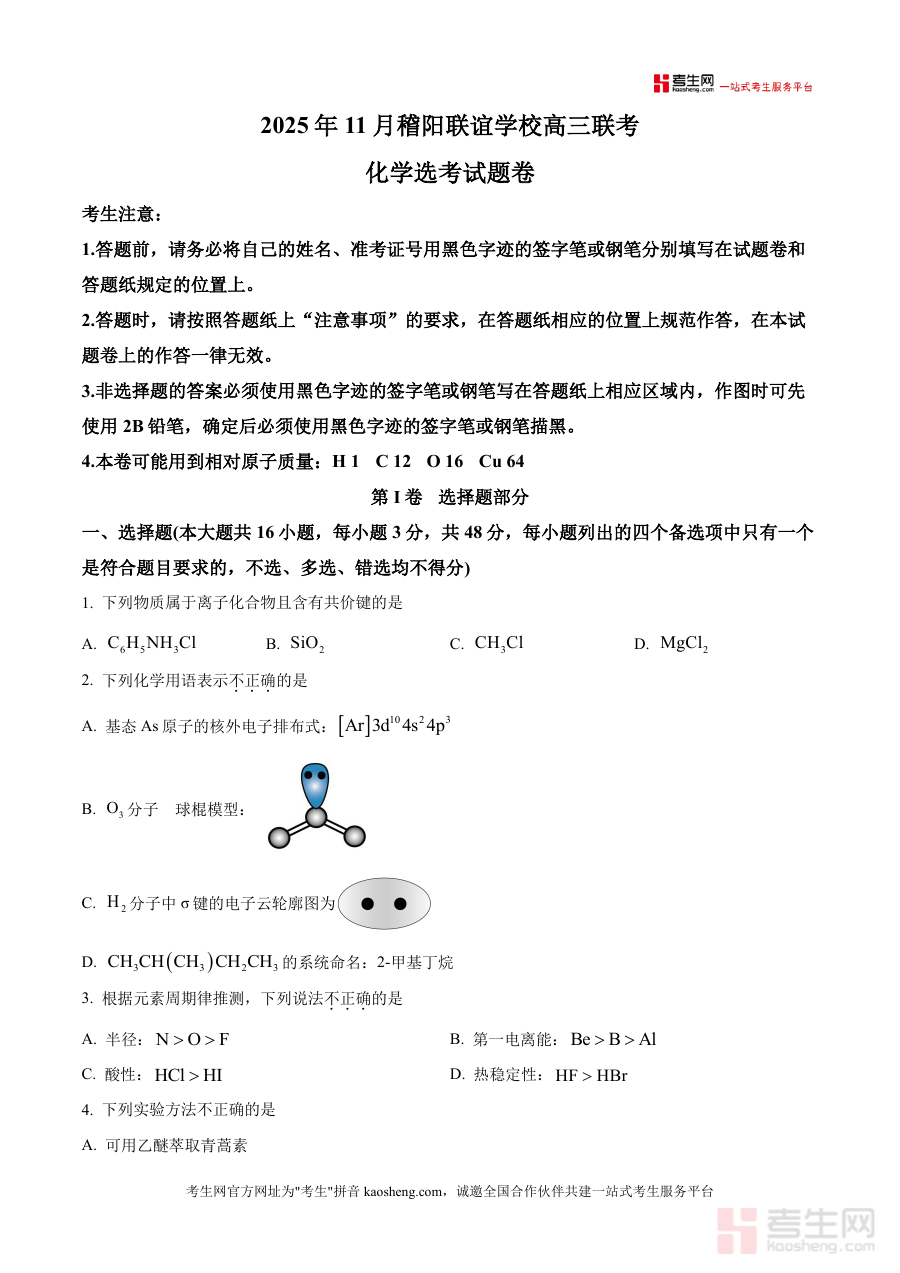 该资料适用于浙江省稽阳联谊学校及参与同类联考体系下相关学校中的高三学生群体以及化学学科教师和备考辅导人员;作为阶段性检测资料,可以帮助使用者直观把握本次考试题型分布与考查形式,并为后续复习安排提供参考依据,但不涉及任何提升学习效果或具体能力培养相关内容