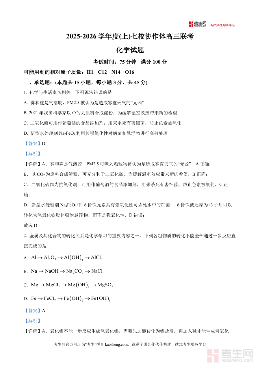 《精品解析:辽宁省七校协作体2025-2026学年高三上学期11月联考化学试卷(解析版)》是一份针对辽宁省七校协作体联合组织的2025-2026学年高三上学期11月化学科目阶段检测试卷所编制的专业解析资料。该资料对应高三上学期中期的联考考试,结合七校协作体的命题背景和高三化学学习进度特点,提供了完整的试卷内容及配套解析。