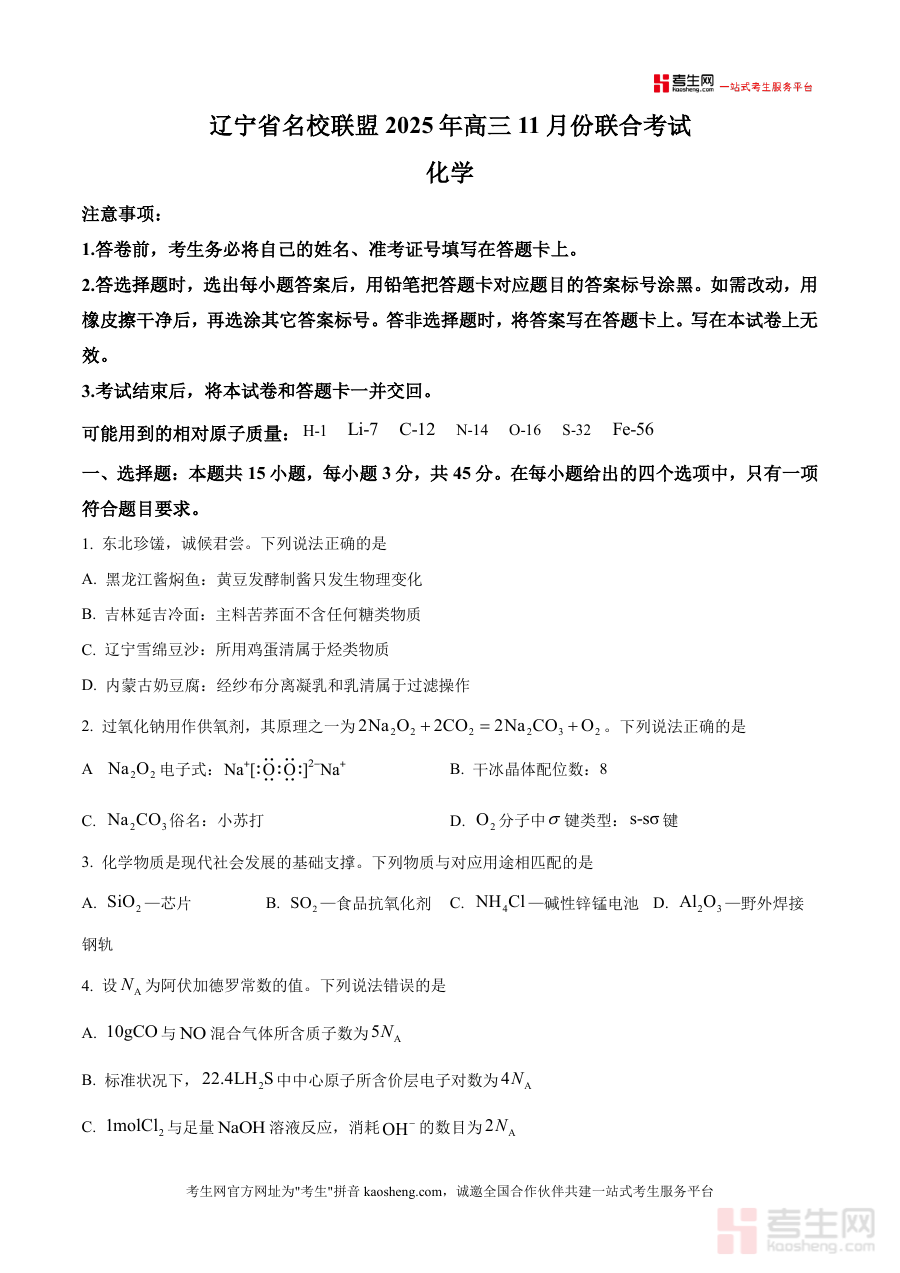 《精品解析:辽宁省名校联盟2025-2026学年高三上学期11月份联考化学试题(原卷版).docx》是一份针对辽宁省名校联盟在2025-2026学年高三上学期11月份组织开展化学联合考试所编制原卷资料,该考试覆盖辽宁省内多所知名高中,属于高三阶段重要中期阶段性测试,旨在通过统一命题形式,客观反映联盟内高三学生化学学科阶段性学习成效与知识掌握情况,为后续教学调整提供依据支撑.