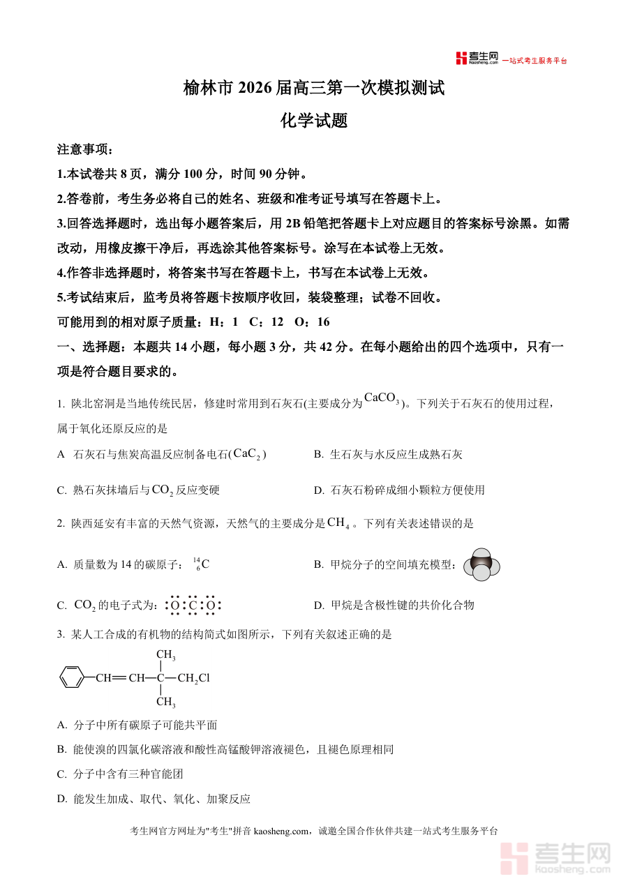 本资料适用于陕西省榆林市2026届高三在读学生及从事高三化学教学工作的教师群体,作为高三上学期首次模拟测试原卷资料其核心价值在于为使用者提供真实 的试卷呈现形式帮助师生明确阶段检测核心目标为后续复习安排与教学调整提供可靠基础依据支持高效备考与针对性教学实施