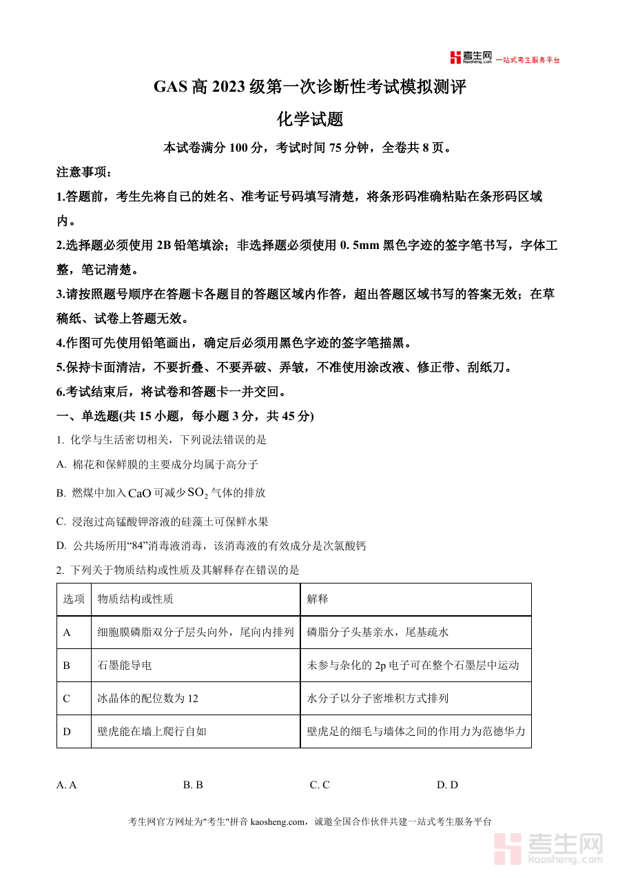 该资料能够帮助使用者熟悉四川省广安市字节精准教育联盟高三一模化学考试时长(75分钟)、满分分值(100分)、答题规范(如姓名准考证号填写、条形码粘贴等要求)及试卷基本呈现形式等核心元信息,为后续备考规划与阶段性复习提供明确方向参考,助力提前适应考试流程与要求,减少因不熟悉规则产生的失误。