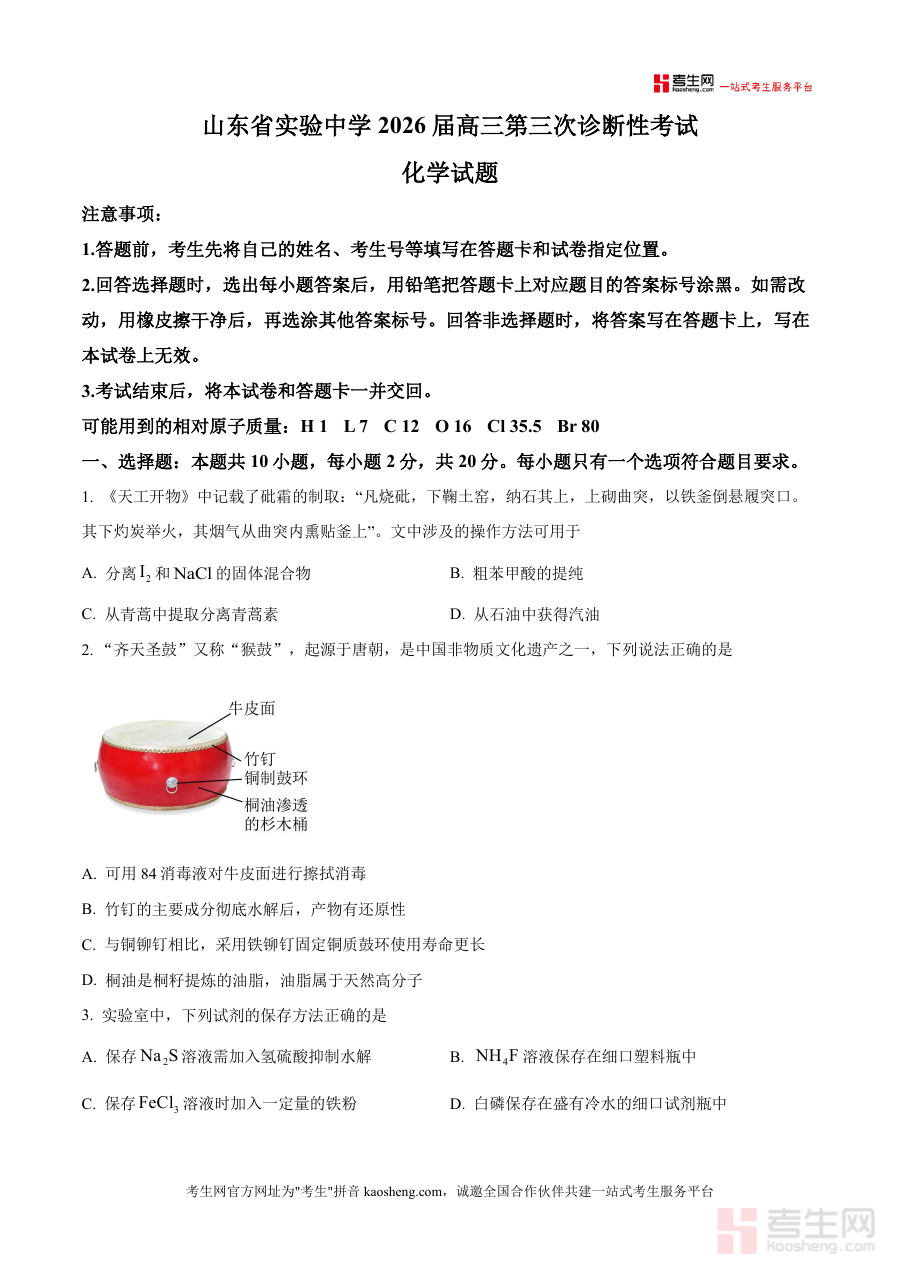 《精品解析:山东省实验中学2026届高三上学期第三次诊断性考试化学试卷(原卷版)》是一份针对山东省实验中学2026届高三学生设计的化学科阶段性诊断考试原卷资料,对应高三上学期第三次诊断性检测场景,旨在为学生提供与实际考试完全一致 的试卷内容,帮助其熟悉该次诊断性考试化学科目的题型设置框架、答题规范要求及整体呈现形式,是贴合该阶段学情检测需求且具有实用性的备考资料。