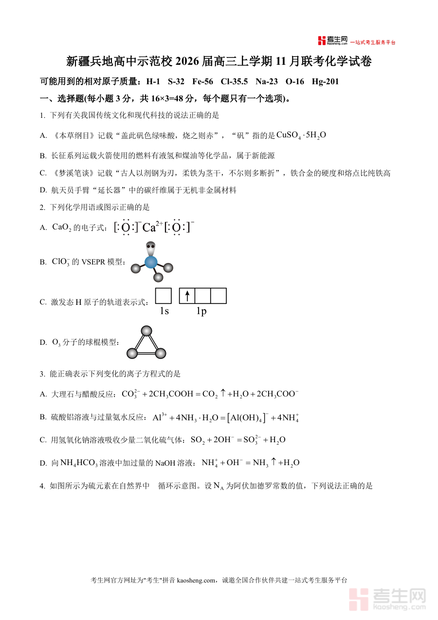 《精品解析:新疆兵地高中示范校2026届高三上学期11月联考化学试卷(原卷版)》是一份针对新疆兵地高中示范校2026届高三学生上学期11月联考设计制作的化学学科备考资料。该资料对应新疆兵地高中示范校联合组织开展的高三上学期中期阶段性考试,考试时间节点处于高三上学期11月阶段,符合高三学生中期学习成果检测与备考推进需求,其来源与定位清晰明确,直接关联该区域示范校的联合教学检测活动,为使用者提供贴合区域教学实际情况的数据支撑材料之一。
