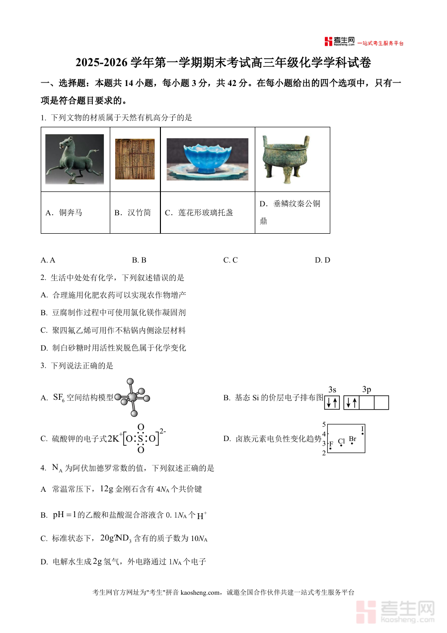 《精品解析:甘肃省兰州市八校联考2025-2026学年高三上学期期末考试 化学试卷(原卷版)》是一份对应甘肃省兰州市八校联考在2025-2026学年高三上学期组织实施的期末考试化学学科原卷资料,明确指向该地区八所学校联合举办、面向高三年级上学期期末阶段开展的化学学科检测考试,属于区域校际联考性质的阶段性学业水平测试资料,为相关备考主体提供了贴合该次考试实际场景的原卷内容载体。